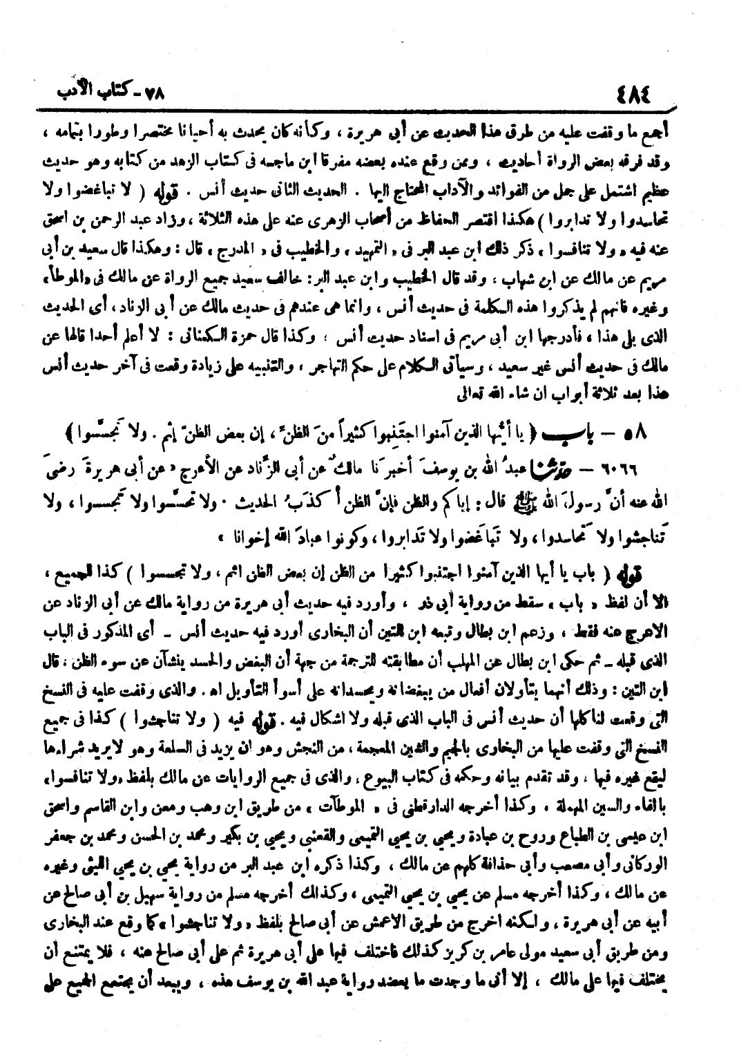 كَذَا لِلْجَمِيعِ إِلَّا أَنَّ لَفْظَ بَابٍ سَقَطَ من رِوَايَة أبي ذَر وَأورد فِيهِ حَدِيثُ أَبِي هُرَيْرَةَ مِنْ رِوَايَةِ مَالِكٍ عَنْ أَبِي الزِّنَادِ عَنِ الْأَعْرَجِ عَنْهُ فَقَطْ وَزَعَمَ بن بطال وَتَبعهُ بن التِّينِ أَنَّ الْبُخَارِيَّ أَوْرَدَ فِيهِ حَدِيثَ أَنَسٍ أَيِ الْمَذْكُورُ فِي الْبَابِ الَّذِي قَبْلَهُ ثُمَّ حكى بن بَطَّالٍ عَنِ الْمُهَلَّبِ أَنَّ مُطَابَقَتَهُ لِلتَّرْجَمَةِ مِنْ جِهَةِ أَنَّ الْبُغْضَ وَالْحَسَدَ يَنْشَآنِ عَنْ سُوءِ الظَّن قَالَ بن التِّينِ وَذَلِكَ أَنَّهُمَا يَتَأَوَّلَانِ أَفْعَالَ مَنْ يُبْغِضَانِهِ وَيَحْسُدَانِهِ عَلَى أَسْوَأِ التَّأْوِيلِ اه وَالَّذِي وَقَفْتُ عَلَيْهِ فِي النُّسَخِ الَّتِي وَقَعَتْ لَنَا كُلِّهَا أَنَّ حَدِيثَ أَنَسٍ فِي الْبَابِ الَّذِي قَبْلَهُ وَلَا إِشْكَالَ فِيهِ قَوْلُهُ فِيهِ وَلَا تَنَاجَشُوا كَذَا فِي جَمِيعِ النُّسَخِ الَّتِي وَقَفْتُ عَلَيْهَا مِنَ الْبُخَارِيِّ بِالْجِيمِ وَالشِّينِ الْمُعْجَمَةِ مِنَ النَّجْشِ وَهُوَ أَنْ يَزِيدَ فِي السِّلْعَةِ وَهُوَ لَا يُرِيدُ شِرَاءَهَا لِيَقَعَ غَيْرُهُ فِيهَا وَقَدْ تَقَدَّمَ بَيَانُهُ وَحُكْمُهُ فِي كِتَابِ الْبُيُوعِ وَالَّذِي فِي جَمِيعِ الرِّوَايَاتِ عَنْ مَالِكٍ بِلَفْظِ وَلَا تَنَافَسُوا بِالْفَاءِ وَالسِّينِ الْمُهْمَلَةِ وَكَذَا أَخْرَجَهُ الدَّارَقُطْنِيُّ فِي الموطآت من طَرِيق بن وهب ومعن وبن الْقَاسِمِ وَإِسْحَاقَ بْنِ عِيسَى بْنِ الطَّبَّاعِ وَرَوْحِ بْنِ عُبَادَةَ وَيَحْيَى بْنِ يَحْيَى التَّمِيمِيِّ وَالْقَعْنَبِيِّ وَيَحْيَى بْنِ بُكَيْرٍ وَمُحَمَّدِ بْنِ الْحَسَنِ وَمُحَمَّدِ بْنِ جَعْفَرٍ الْوَرَكَانِيِّ وَأَبِي مُصْعَبٍ وَأَبِي حُذَافَةَ كلهم عَن مَالك وَكَذَا ذكره بن عَبْدِ الْبَرِّ مِنْ رِوَايَةِ يَحْيَى بْنِ يَحْيَى اللَّيْثِيِّ وَغَيْرِهِ عَنْ مَالِكٍ وَكَذَا أَخْرَجَهُ مُسْلِمٌ عَنْ يَحْيَى بْنِ يَحْيَى التَّمِيمِيِّ وَكَذَلِكَ أَخْرَجَهُ مُسْلِمٍ مِنْ رِوَايَةِ سُهَيْلِ بْنِ أَبِي صَالِحٍ عَنْ أَبِيهِ عَنْ أَبِي هُرَيْرَةَ وَلَكِنَّهُ أَخْرَجَ مِنْ طَرِيقِ الْأَعْمَشِ عَنْ أَبِي صَالِحٍ بِلَفْظِ وَلَا تَنَاجَشُوا كَمَا وَقَعَ عِنْدَ الْبُخَارِيِّ وَمَنْ طَرِيقِ أَبِي سَعِيدٍ مَوْلَى عَامِرِ بْنِ كُرَيْزٍ كَذَلِكَ فَاخْتُلِفَ فِيهَا عَلَى أَبِي هُرَيْرَةَ ثُمَّ على أَبِي صَالِحٍ عَنْهُ فَلَا يَمْتَنِعُ أَنْ يُخْتَلَفَ فِيهَا عَلَى مَالِكٍ إِلَّا أَنِّي مَا وَجَدْتُ مَا يُعَضِّدُ رِوَايَةَ عَبْدِ اللَّهِ بْنِ يُوسُفَ هَذِهِ وَيَبْعُدُ أَنْ يَجْتَمِعَ الْجَمِيعُ عَلَى