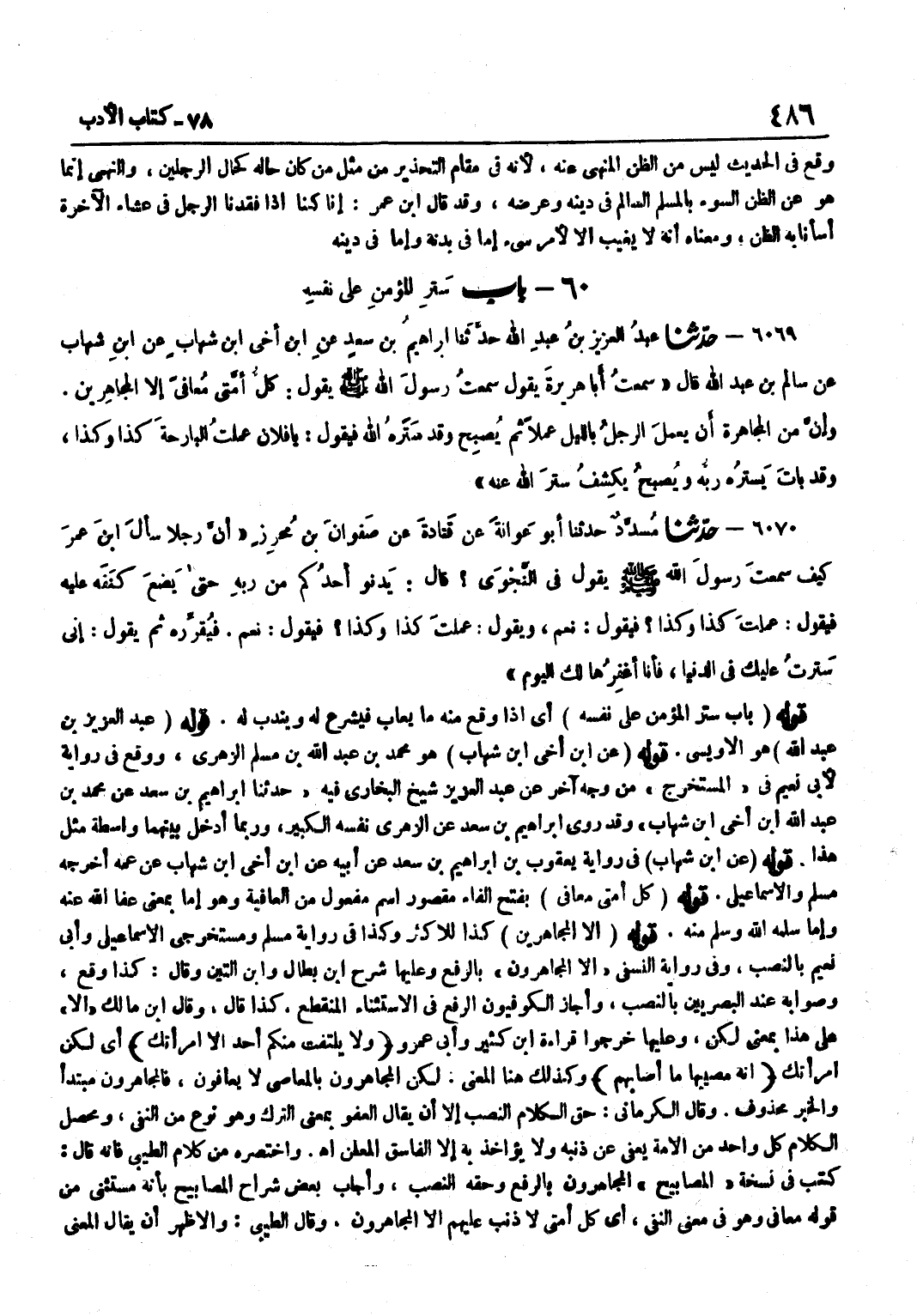 [6069] قَوْلُهُ عَبْدُ الْعَزِيزِ بْنُ عَبْدِ اللَّهِ هُوَ الْأُوَيْسِيُّ قَوْله عَن بن أخي بن شِهَابٍ هُوَ مُحَمَّدُ بْنُ عَبْدِ اللَّهِ بْنِ مُسْلِمٍ الزُّهْرِيُّ وَوَقَعَ فِي رِوَايَةٍ لِأَبِي نُعَيْمٍ فِي الْمُسْتَخْرَجِ مِنْ وَجْهٍ آخَرَ عَنْ عَبْدِ الْعَزِيزِ شَيْخِ الْبُخَارِيِّ فِيهِ حَدَّثَنَا إِبْرَاهِيمُ بْنُ سعد عَن مُحَمَّد بن عبد الله بن أخي بن شِهَابٍ وَقَدْ رَوَى إِبْرَاهِيمُ بْنُ سَعْدٍ عَنِ الزُّهْرِيِّ نَفْسِهِ الْكَبِيرِ وَرُبَّمَا أَدْخَلَ بَيْنَهُمَا وَاسِطَةً مثل هَذَا قَوْله عَن بن شِهَابٍ فِي رِوَايَةِ يَعْقُوبَ بْنِ إِبْرَاهِيمَ بْنِ سَعْدٍ عَنْ أَبِيهِ عَن بن أخي بن شِهَابٍ عَنْ عَمِّهِ أَخْرَجَهُ مُسْلِمٌ وَالْإِسْمَاعِيلِيُّ قَوْلُهُ كُلُّ أُمَّتِي مُعَافًى بِفَتْحِ الْفَاءِ مَقْصُورٌ اسْمُ مَفْعُولٍ مِنَ الْعَافِيَةِ وَهُوَ إِمَّا بِمَعْنَى عَفَا اللَّهُ عَنْهُ وَإِمَّا سَلَّمَهُ اللَّهُ وَسَلِمَ مِنْهُ قَوْله إِلَّا المجاهرين كَذَا لِلْأَكْثَرِ وَكَذَا فِي رِوَايَةِ مُسْلِمٍ وَمُسْتَخْرِجِي الْإِسْمَاعِيلِيِّ وَأَبِي نُعَيْمٍ بِالنَّصْبِ وَفِي رِوَايَةِ النَّسَفِيِّ إِلَّا المجاهرون بِالرَّفْع وَعَلَيْهَا شرح بن بطال وبن التِّينِ وَقَالَ كَذَا وَقَعَ وَصَوَابُهُ عِنْدَ الْبَصْرِيِّينَ بِالنَّصْبِ وَأَجَازَ الْكُوفِيُّونَ الرَّفْعَ فِي الِاسْتِثْنَاءِ الْمُنْقَطِعِ كَذَا قَالَ وَقَالَ بن مَالِكٍ إِلَّا عَلَى هَذَا بِمَعْنَى لَكِنْ وَعَلَيْهَا خَرجُوا قِرَاءَة بن كَثِيرٍ وَأَبِي عَمْرٍو وَلَا يَلْتَفِتْ مِنْكُمْ أَحَدٌ إِلَّا امْرَأَتك أَيْ لَكِنِ امْرَأَتكَ إِنَّهُ مُصِيبُهَا مَا أَصَابَهُمْ وَكَذَلِكَ هُنَا الْمَعْنَى لَكِنِ الْمُجَاهِرُونَ بِالْمَعَاصِي لَا يُعَافُونَ فَالْمُجَاهِرُونَ مُبْتَدَأٌ وَالْخَبَرُ مَحْذُوفٌ وَقَالَ الْكِرْمَانِيُّ حَقُّ الْكَلَامِ النَّصْبُ إِلَّا أَنْ يُقَالَ الْعَفْوُ بِمَعْنَى التَّرْكِ وَهُوَ نَوْعٌ مِنَ النَّفْيِ وَمُحَصَّلُ الْكَلَامِ كُلُّ وَاحِدٍ مِنَ الْأُمَّةِ يُعْفَى عَنْ ذَنْبِهِ وَلَا يُؤَاخَذُ بِهِ إِلَّا الْفَاسِقَ الْمُعْلِنَ اه وَاخْتَصَرَهُ مِنْ كَلَامِ الطِّيبِيِّ فَإِنَّهُ قَالَ كَتَبَ فِي نُسْخَةِ الْمَصَابِيحِ الْمُجَاهِرُونَ بِالرَّفْعِ وَحَقُّهُ النَّصْبُ وَأَجَابَ بَعْضُ شُرَّاحِ الْمَصَابِيحِ بِأَنَّهُ مُسْتَثْنًى مِنْ قَوْلِهِ مُعَافًى وَهُوَ فِي مَعْنَى النَّفْيِ أَيْ كُلُّ أُمَّتِي لَا ذَنْبَ عَلَيْهِمْ إِلَّا المجاهرون وَقَالَ الطَّيِّبِيّ وَالْأَظْهَر أَنْ يُقَالَ الْمَعْنَى