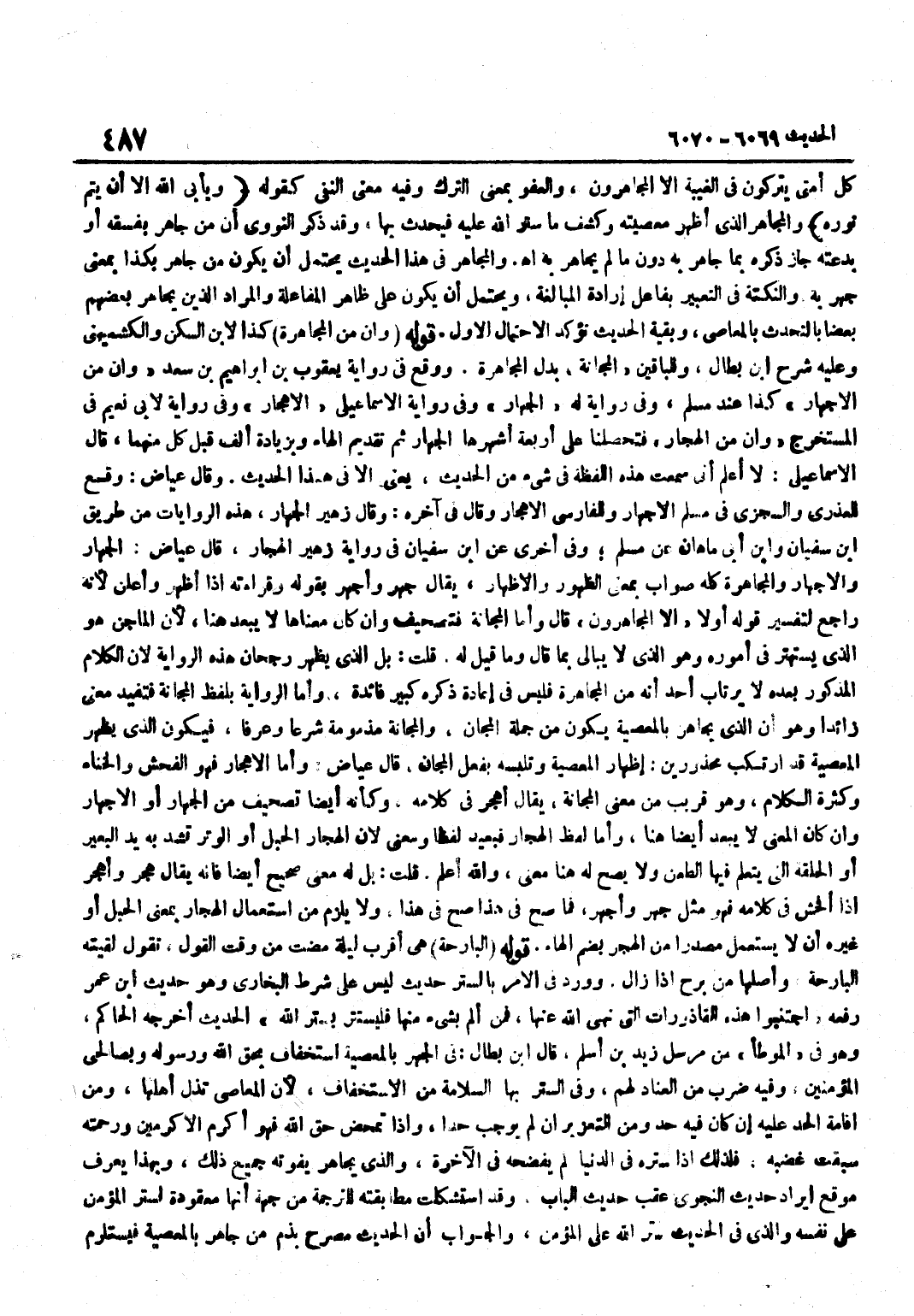 كُلُّ أُمَّتِي يُتْرَكُونَ فِي الْغِيبَةِ إِلَّا الْمُجَاهِرُونَ وَالْعَفْوُ بِمَعْنَى التَّرْكِ وَفِيهِ مَعْنَى النَّفْيِ كَقَوْلِهِ ويأبى الله الا أَن يتم نوره وَالْمُجَاهِرُ الَّذِي أَظْهَرَ مَعْصِيَتَهُ وَكَشَفَ مَا سَتَرَ اللَّهُ عَلَيْهِ فَيُحَدِّثُ بِهَا وَقَدْ ذَكَرَ النَّوَوِيُّ أَنَّ مَنْ جَاهَرَ بِفِسْقِهِ أَوْ بِدْعَتِهِ جَازَ ذِكْرُهُ بِمَا جَاهَرَ بِهِ دُونَ مَا لَمْ يُجَاهِرْ بِهِ اه وَالْمُجَاهِرُ فِي هَذَا الْحَدِيثِ يَحْتَمِلُ أَنْ يَكُونَ مَنْ جَاهَرَ بِكَذَا بِمَعْنَى جَهَرَ بِهِ وَالنُّكْتَةُ فِي التَّعْبِيرِ بِفَاعَلَ إِرَادَةُ الْمُبَالَغَةِ وَيَحْتَمِلُ أَنْ يَكُونَ عَلَى ظَاهِرِ الْمُفَاعَلَةِ وَالْمرَاد الَّذين يُجَاهِرُ بَعْضُهُمْ بَعْضًا بِالتَّحَدُّثِ بِالْمَعَاصِي وَبَقِيَّةُ الْحَدِيثِ توكد الِاحْتِمَالَ الْأَوَّلَ قَوْلُهُ وَإِنَّ مِنَ الْمُجَاهَرَةِ كَذَا لِابْنِ السكن والكشميهني وَعَلِيهِ شرح بن بَطَّالٍ وَلِلْبَاقِينَ الْمَجَانَةُ بَدَلَ الْمُجَاهَرَةِ وَوَقَعَ فِي رِوَايَةِ يَعْقُوبَ بْنِ إِبْرَاهِيمَ بْنِ سَعْدٍ وَإِنَّ مِنَ الْإِجْهَارِ كَذَا عِنْدَ مُسْلِمٍ وَفِي رِوَايَةٍ لَهُ الْجِهَارُ وَفِي رِوَايَةِ الْإِسْمَاعِيلِيِّ الْإِهْجَارُ وَفِي رِوَايَةٍ لِأَبِي نُعَيْمٍ فِي الْمُسْتَخْرَجِ وَإِنْ مِنَ الْهِجَارِ فَتَحَصَّلْنَا عَلَى أَرْبَعَةٍ أَشْهَرُهَا الْجِهَارُ ثُمَّ تَقْدِيمُ الْهَاءِ وَبِزِيَادَةِ أَلِفٍ قَبْلَ كُلِّ مِنْهُمَا قَالَ الْإِسْمَاعِيلِيُّ لَا أَعْلَمُ أَنِّي سَمِعْتُ هَذِهِ اللَّفْظَةَ فِي شَيْءٍ مِنَ الْحَدِيثِ يَعْنِي إِلَّا فِي هَذَا الْحَدِيثِ وَقَالَ عِيَاضٌ وَقَعَ لِلْعَذَرِيِّ وَالسِّجْزِيِّ فِي مُسْلِمٍ الْإِجْهَارُ وَلِلْفَارِسِيِّ الْإِهْجَارُ وَقَالَ فِي آخِرِهِ وَقَالَ زُهَيْرٌ الْجِهَارُ هَذِهِ الرِّوَايَاتُ من طَرِيق بن سُفْيَان وبن أَبِي مَاهَانَ عَنْ مُسْلِمٍ وَفِي أُخْرَى عَنِ بن سُفْيَانَ فِي رِوَايَةِ زُهَيْرٍ الْهِجَارُ قَالَ عِيَاضٌ الْجِهَارُ وَالْإِجْهَارُ وَالْمُجَاهَرَةُ كُلُّهُ صَوَابٌ بِمَعْنَى الظُّهُورِ والاظهار يُقَال جَهَرَ وَأَجْهَرَ بِقَوْلِهِ وَقِرَاءَتِهِ إِذَا أَظْهَرَ وَأَعْلَنَ لِأَنَّهُ رَاجِعٌ لِتَفْسِيرِ قَوْلِهِ أَوَّلًا إِلَّا الْمُجَاهِرُونَ قَالَ وَأَمَّا الْمَجَانَةُ فَتَصْحِيفٌ وَإِنْ كَانَ مَعْنَاهَا لَا يَبْعُدُ هُنَا لِأَنَّ الْمَاجِنَ هُوَ الَّذِي يَسْتَهْتِرُ فِي أُمُورِهِ وَهُوَ الَّذِي لَا يُبَالِي بِمَا قَالَ وَمَا قِيلَ لَهُ قُلْتُ بَلِ الَّذِي يَظْهَرُ رُجْحَانُ هَذِهِ الرِّوَايَةِ لِأَنَّ الْكَلَامَ الْمَذْكُورَ بَعْدَهُ لَا يَرْتَابُ أَحَدٌ أَنَّهُ مِنَ الْمُجَاهَرَةِ فَلَيْسَ فِي إِعَادَةِ ذِكْرِهِ كَبِيرُ فَائِدَةٍ وَأَمَّا الرِّوَايَةُ بِلَفْظِ الْمَجَانَةِ فَتُفِيدُ مَعْنًى زَائِدًا وَهُوَ أَنَّ الَّذِي يُجَاهِرُ بِالْمَعْصِيَةِ يَكُونُ مِنْ جُمْلَةِ الْمُجَّانِ وَالْمَجَانَةُ مَذْمُومَةٌ شَرْعًا وَعُرْفًا فَيَكُونُ الَّذِي يُظْهِرُ الْمَعْصِيَةَ قَدِ ارْتَكَبَ مَحْذُورَيْنِ إِظْهَارَ الْمعْصِيَة وتلبسه بِفعل المجان قَالَ عِيَاض وَأم الْإِهْجَارُ فَهُوَ الْفُحْشُ وَالْخَنَاءُ وَكَثْرَةُ الْكَلَامِ وَهُوَ قَرِيبٌ مِنْ مَعْنَى الْمَجَانَةِ يُقَالُ أَهْجَرَ فِي كَلَامِهِ وَكَأَنَّهُ أَيْضًا تَصْحِيفٌ مِنَ الْجِهَارِ أَوِ الْإِجْهَارِ وَإِنْ كَانَ الْمَعْنَى لَا يَبْعُدُ أَيْضًا هُنَا وَأَمَّا لَفْظُ الْهِجَارِ فَبَعِيدٌ لَفْظًا وَمَعْنًى لِأَنَّ الْهِجَارَ الْحَبْلُ أَوِ الْوِتْرُ تُشَدُّ بِهِ يَدُ الْبَعِيرِ أَوِ الْحَلْقَةُ الَّتِي يُتَعَلَّمُ فِيهَا الطَّعْنُ وَلَا يَصِحُّ لَهُ هُنَا مَعْنًى وَاللَّهُ أَعْلَ