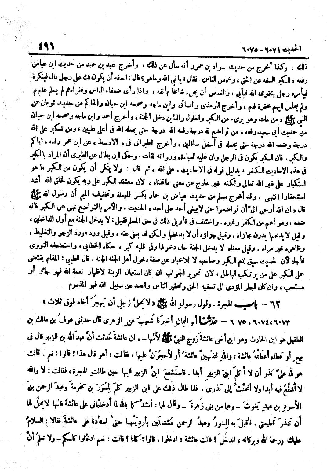 ذَلِكَ وَكَذَا أَخْرَجَ مِنْ حَدِيثِ سَوَادِ بْنِ عَمْرٍو أَنَّهُ سَأَلَ عَنْ ذَلِكَ وَأَخْرَجَ عَبْدُ بن حميد من حَدِيث بن عَبَّاسٍ رَفَعَهُ الْكِبْرُ السَّفَهُ عَنِ الْحَقِّ وَغَمْصُ النَّاسِ فَقَالَ يَا نَبِيَّ اللَّهِ وَمَا هُوَ قَالَ السَّفَهُ أَنْ يَكُونَ لَكَ عَلَى رَجُلٍ مَالٌ فَيُنْكِرُهُ فَيَأْمُرُهُ رَجُلٌ بِتَقْوَى اللَّهِ فَيَأْبَى وَالْغَمْصُ أَنْ يَجِيءَ شَامِخًا بِأَنْفِهِ وَإِذَا رَأَى ضُعَفَاءَ النَّاسِ وَفُقَرَاءَهُمْ لَمْ يُسَلِّمْ عَلَيْهِمْ وَلَمْ يَجْلِسْ إِلَيْهِمْ مَحْقَرَةً لَهُمْ وَأَخْرَجَ التِّرْمِذِيُّ وَالنَّسَائِيُّ وبن ماجة وَصَححهُ بن حِبَّانَ وَالْحَاكِمُ مِنْ حَدِيثِ ثَوْبَانَ عَنِ النَّبِيُّ صَلَّى اللَّهُ عَلَيْهِ وَسَلَّمَ مَنْ مَاتَ وَهُوَ بَرِيءٌ مِنَ الْكِبْرِ وَالْغُلُولِ وَالدَّيْنِ دَخَلَ الْجَنَّةَ وَأخرج أَحْمد وبن ماجة وَصَححهُ بن حِبَّانَ مِنْ حَدِيثِ أَبِي سَعِيدٍ رَفَعَهُ مَنْ تَوَاضَعَ لِلَّهِ دَرَجَةً رَفَعَهُ اللَّهُ دَرَجَةً حَتَّى يَجْعَلَهُ اللَّهُ فِي أَعْلَى عِلِّيِّينَ وَمَنْ تَكَبَّرَ عَلَى اللَّهِ دَرَجَةً وَضَعَهُ اللَّهُ دَرَجَةً حَتَّى يَجْعَلَهُ فِي أَسْفَلِ سَافِلِينَ وَأَخْرَجَ الطَّبَرَانِيُّ فِي الْأَوْسَط عَن بن عُمَرَ رَفَعَهُ إِيَّاكُمْ وَالْكِبْرَ فَإِنَّ الْكِبْرَ يَكُونُ فِي الرَّجُلِ وَإِنَّ عَلَيْهِ الْعَبَاءَةَ وَرُوَاتُهُ ثِقَاتٌ وَحكى بن بَطَّالٍ عَنِ الطَّبَرِيِّ أَنَّ الْمُرَادَ بِالْكِبْرِ فِي هَذِهِ الْأَحَادِيثِ الْكُفْرُ بِدَلِيلِ قَوْلِهِ فِي الْأَحَادِيثِ عَلَى اللَّهِ ثُمَّ قَالَ وَلَا يُنْكَرُ أَنْ يَكُونَ مِنَ الْكِبْرِ مَا هُوَ اسْتِكْبَارٌ عَلَى غَيْرِ اللَّهِ تَعَالَى وَلَكِنَّهُ غَيْرُ خَارِجٍ عَنْ مَعْنَى مَا قُلْنَاهُ لِأَنَّ مُعْتَقِدَ الْكِبْرِ عَلَى رَبِّهِ يَكُونُ لِخَلْقِ اللَّهِ أَشَدَّ اسْتِحْقَارًا انْتَهَى وَقَدْ أَخْرَجَ مُسْلِمٌ مِنْ حَدِيثِ عِيَاضِ بْنِ حمَار بِكَسْرِ الْمُهْمَلَةِ وَتَخْفِيفِ الْمِيمِ أَنَّ رَسُولَ اللَّهِ صَلَّى اللَّهُ عَلَيْهِ وَسَلَّمَ قَالَ إِنَّ اللَّهَ أَوْحَى إِلَيَّ أَنْ تَوَاضَعُوا حَتَّى لَا يَبْغِيَ أَحَدٌ عَلَى أَحَدٍ الْحَدِيثَ وَالْأَمْرُ بِالتَّوَاضُعِ نَهْيٌ عَنِ الْكِبْرِ فَإِنَّهُ ضِدُّهُ وَهُوَ أَعَمُّ مِنَ الْكُفْرِ وَغَيْرِهِ وَاخْتُلِفَ فِي تَأْوِيلِ ذَلِكَ فِي حَقِّ الْمُسْلِمِ فَقِيلَ لَا يَدْخُلُ الْجَنَّةَ مَعَ أَوَّلِ الدَّاخِلِينَ وَقِيلَ لَا يَدْخُلُهَا بِدُونِ مُجَازَاةٍ وَقِيلَ جَزَاؤُهُ أَنْ لَا يَدْخُلَهَا وَلَكِنْ قَدْ يُعْفَى عَنْهُ وَقِيلَ وَرَدَ مَوْرِدَ الزَّجْرِ وَالتَّغْلِيظِ وَظَاهِرُهُ غَيْرُ مُرَادٍ وَقِيلَ مَعْنَاهُ لَا يَدْخُلُ الْجَنَّةَ حَالَ دُخُولِهَا وَفِي قَلْبِهِ كِبْرٌ حَكَاهُ الْخَطَّابِيُّ وَاسْتَضْعَفَهُ النَّوَوِيُّ فَأَجَادَ لِأَنَّ الْحَدِيثَ سِيقَ لِذَمِّ الْكِبْرِ وَصَاحِبِهِ لَا لِلْإِخْبَارِ عَنْ صِفَةِ دُخُولِ أَهْلِ الْجَنَّةِ الْجَنَّةَ قَالَ الطِّيبِيُّ الْمَقَامُ يَقْتَضِي حَمْلَ الْكِبْرِ عَلَى مَنْ يَرْتَكِبُ الْبَاطِلَ لِأَنَّ تَحْرِيرَ الْجَوَابِ إِنْ كَانَ اسْتِعْمَالُ الزِّينَةِ لِإِظْهَارِ نِعْمَةِ اللَّهِ فَهُوَ جَائِزٌ أَوْ مُسْتَحَبٌّ وَإِنْ كَانَ لِلْبَطَرِ الْمُؤَدِّي إِلَى تَسْفِيهِ الْحَقِّ وَتَحْقِيرِ النَّاسِ وَالصَّدِّ عَنْ سَبِيلِ اللَّهِ فَهُوَ المذموم