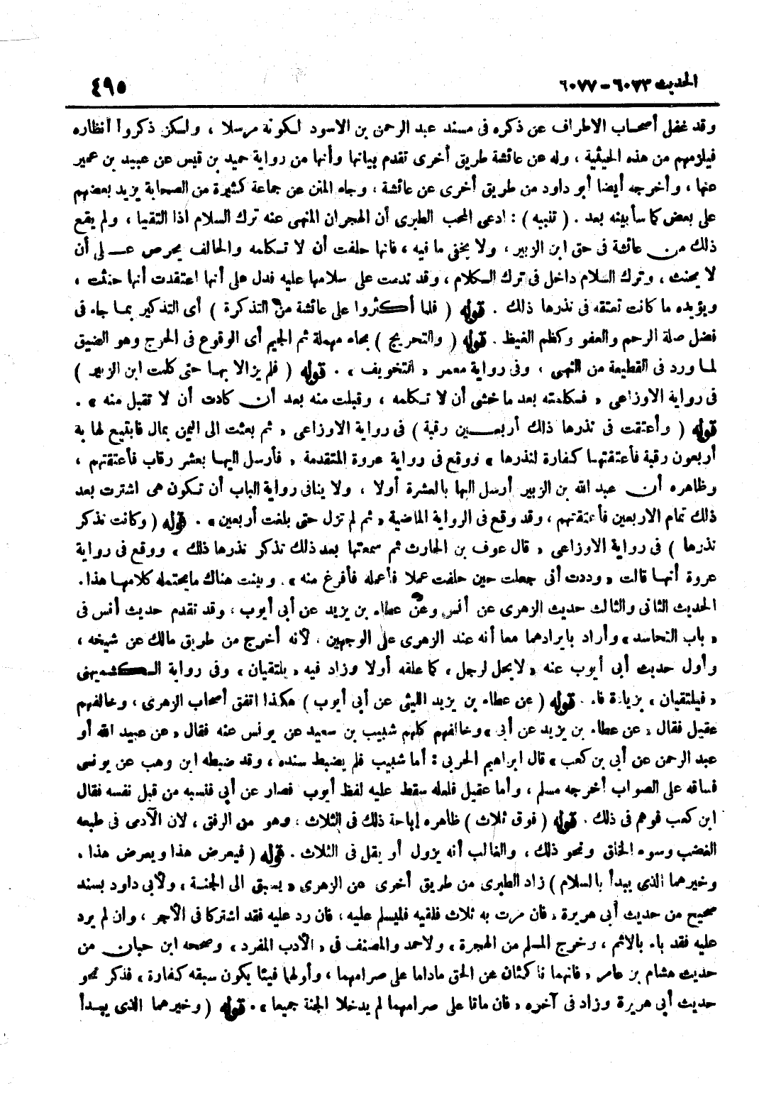 وَقَدْ غَفَلَ أَصْحَابُ الْأَطْرَافِ عَنْ ذِكْرِهِ فِي مُسْنَدِ عَبْدِ الرَّحْمَنِ بْنِ الْأَسْوَدِ لِكَوْنِهِ مُرْسَلًا وَلَكِنْ ذَكَرُوا أَنْظَارَهُ فَيَلْزَمُهُمْ مِنْ هَذِهِ الْحَيْثِيَّةِ وَلَهُ عَنْ عَائِشَةَ طَرِيقٌ أُخْرَى تَقَدَّمَ بَيَانُهَا وَأَنَّهَا مِنْ رِوَايَةِ حُمَيْدِ بْنِ قَيْسٍ عَنْ عُبَيْدِ بْنِ عُمَيْرٍ عَنْهَا وَأَخْرَجَهُ أَيْضًا أَبُو دَاوُدَ مِنْ طَرِيقٍ أُخْرَى عَنْ عَائِشَةَ وَجَاءَ الْمَتْنُ عَنْ جَمَاعَةٍ كَثِيرَةٍ مِنَ الصَّحَابَةِ يَزِيدُ بَعْضُهُمْ عَلَى بَعْضٍ كَمَا سَأُبَيِّنُهُ بَعْدُ تَنْبِيهٌ ادَّعَى الْمُحِبُّ الطَّبَرِيُّ أَنَّ الْهِجْرَانَ الْمَنْهِيَّ عَنْهُ تَرْكُ السَّلَامِ إِذَا الْتَقَيَا وَلَمْ يَقَعْ ذَلِكَ من عَائِشَة فِي حق بن الزُّبَيْرِ وَلَا يَخْفَى مَا فِيهِ فَإِنَّهَا حَلَفَتْ أَنْ لَا تُكَلِّمَهُ وَالْحَالِفُ يَحْرِصُ عَلَى أَنْ لَا يَحْنَثَ وَتَرْكُ السَّلَامِ دَاخِلٌ فِي تَرْكِ الْكَلَامِ وَقَدْ نَدِمَتْ عَلَى سَلَامِهَا عَلَيْهِ فَدَلَّ عَلَى أَنَّهَا اعْتَقَدَتْ أَنَّهَا حَنِثَتْ وَيُؤَيِّدُهُ مَا كَانَتْ تُعْتِقُهُ فِي نَذْرِهَا ذَلِكَ قَوْلُهُ فَلَمَّا أَكْثَرُوا عَلَى عَائِشَةَ مِنَ التَّذْكِرَةِ أَيِ التَّذْكِيرِ بِمَا جَاءَ فِي فَضْلِ صِلَةِ الرَّحِمِ وَالْعَفْوِ وَكَظْمِ الْغَيْظِ قَوْلُهُ وَالتَّحْرِيجِ بِحَاءٍ مُهْمَلَةٍ ثُمَّ الْجِيمِ أَيِ الْوُقُوعُ فِي الْحَرَجِ وَهُوَ الضِّيقُ لِمَا وَرَدَ فِي الْقَطِيعَةِ مِنَ النَّهْيِ وَفِي رِوَايَةِ مَعْمَرٍ التَّخْوِيفِ قَوْلُهُ فَلَمْ يَزَالَا بِهَا حَتَّى كلمت بن الزُّبَيْرِ فِي رِوَايَةِ الْأَوْزَاعِيِّ فَكَلَّمَتْهُ بَعْدَ مَا خَشِيَ أَنْ لَا تُكَلِّمَهُ وَقَبِلَتْ مِنْهُ بَعْدَ أَنْ كَادَتْ أَنْ لَا تَقْبَلَ مِنْهُ قَوْلُهُ وَأَعْتَقَتْ فِي نَذْرِهَا ذَلِكَ أَرْبَعِينَ رَقَبَةً فِي رِوَايَةِ الْأَوْزَاعِيِّ ثُمَّ بَعَثَتْ إِلَى الْيَمَنِ بِمَالٍ فَابْتِيعَ لَهَا بِهِ أَرْبَعُونَ رَقَبَةً فَأَعْتَقَتْهَا كَفَّارَةً لِنَذْرِهَا وَوَقَعَ فِي رِوَايَةِ عُرْوَةَ الْمُتَقَدِّمَةِ فَأَرْسَلَ إِلَيْهَا بِعَشْرِ رِقَابٍ فَأَعْتَقَتْهُمْ وَظَاهِرُهُ أَنَّ عَبْدَ اللَّهِ بْنَ الزُّبَيْرِ أَرْسَلَ إِلَيْهَا بِالْعَشَرَةِ أَوَّلًا وَلَا يُنَافِي رِوَايَةَ الْبَابِ أَنْ تَكُونَ هِيَ اشْتَرَتْ بَعْدَ ذَلِكَ تَمَامَ الْأَرْبَعِينَ فَأَعْتَقَتْهُمْ وَقَدْ وَقَعَ فِي الرِّوَايَةِ الْمَاضِيَةِ ثُمَّ لَمْ تَزَلْ حَتَّى بَلَغَتْ أَرْبَعِينَ قَوْلُهُ وَكَانَتْ تَذْكُرُ نَذْرَهَا فِي رِوَايَةِ الْأَوْزَاعِيِّ قَالَ عَوْفُ بْنُ الْحَارِثِ ثُمَّ سَمِعْتُهَا بَعْدَ ذَلِكَ تَذْكُرُ نَذْرَهَا ذَلِكَ وَوَقَعَ فِي رِوَايَةِ عُرْوَةَ أَنَّهَا قَالَتْ وَدِدْتُ أَنِّي جَعَلْتُ حِينَ حَلَفْتُ عَمَلًا فَأَعْمَلُهُ فَأَفْرُغُ مِنْهُ وَبَيَّنْتُ هُنَاكَ مَا يَحْتَمِلُهُ كَلَامُهَا هَذَا حَدِيثُ الزُّهْرِيِّ عَنْ أَنَسٍ وَعَنْ عَطَاءِ بْنِ يَزِيدَ عَنْ أَبِي أَيُّوبَ وَقَدْ تَقَدَّمَ حَدِيثُ أَنَسٍ فِي بَابِ التَّحَاسُدِ وَأَرَادَ بِإِيرَادِهِمَا مَعًا أَنَّهُ عِنْدَ الزُّهْرِيِّ عَلَى الْوَجْهَيْنِ لِأَنَّهُ أَخْرَجَ مِنْ طَرِيقِ مَالِكٍ عَنْ شَيْخِهِ وَأَوَّلُ حَدِيثِ أَبِي أَيُّوبَ عَنْهُ لَا يَحِلُّ لِرَجُلِ كَمَا عَلَّقَهُ أَوَّلًا وَزَادَ فِيهِ يَلْتَقِيَانِ وَفِي رِوَايَةِ الْكُشْمِيهَنِيِّ فَيَلْتَقِيَانِ بِزِيَادَةِ فَاءٍ