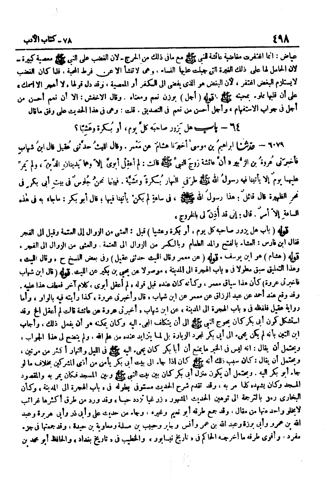 [6079] قَوْله هِشَام هُوَ بن يُوسُفَ قَوْلُهُ عَنْ مَعْمَرٍ وَقَالَ اللَّيْثُ حَدَّثَنِي عُقَيْلٌ وَفِي بَعْضِ النَّسْخِ ح وَقَالَ اللَّيْثُ وَهَذَا التَّعْلِيقُ سَبَقَ مُطَوَّلًا فِي بَابِ الْهِجْرَةِ إِلَى الْمَدِينَةِ مَوْصُولًا عَنْ يَحْيَى بْنِ بُكَيْرٍ عَن اللَّيْث قَوْله قَالَ بن شِهَابٍ فَأَخْبَرَنِي عُرْوَةُ كَأَنَّ هَذَا سِيَاقَ مَعْمَرٍ وَكَأَنَّهُ كَانَ عِنْدَهُ قَبْلَ قَوْلِهِ لَمْ أَعْقِلْ أَبَوَيَّ كَلَامٌ آخَرُ فَعَطَفَ هَذَا عَلَيْهِ وَقَدْ وَقَعَ عِنْدَ أَحْمَدُ عَنْ عَبْدِ الرَّزَّاقِ عَنْ مَعْمَرٍ عَنْ بن شهَاب قَالَ وَأَخْبرنِي عُرْوَة كَذَا رَأَيْتُهُ فِيهِ بِالْوَاوِ وَأَمَّا رِوَايَةُ عُقَيْلٍ فَلَفْظُهُ فِي بَابِ الْهِجْرَةِ إِلَى الْمَدِينَةِ عَنِ بن شِهَابٍ أَخْبَرَنِي عُرْوَةُ عَنْ عَائِشَةَ قَالَتْ لَمْ أَعْقِلْ إِلَخْ وَقَدِ اسْتَشْكَلَ كَوْنُ أَبِي بَكْرٍ كَانَ يُحْوِجُ النَّبِيَّ صَلَّى اللَّهُ عَلَيْهِ وَسَلَّمَ إِلَى أَنْ يَتَكَلَّفَ الْمَجِيءَ إِلَيْهِ وَكَانَ يُمْكِنُهُ هُوَ أَن يفعل ذَلِك وَأجَاب بن التِّينِ بِأَنَّهُ لَمْ يَكُنْ يَجِيءُ إِلَى أَبِي بَكْرٍ لِمُجَرَّدِ الزِّيَارَةِ بَلْ لِمَا يَتَزَايَدُ عِنْدَهُ مِنْ عِلْمِ اللَّهِ وَلَمْ يَتَّضِحْ لِي هَذَا الْجَوَابُ وَيَحْتَمِلُ أَنْ يُقَالَ إِنَّهُ لَيْسَ فِي الْخَبَرِ مَا يَمْنَعُ أَنَّ أَبَا بَكْرٍ كَانَ يَجِيءُ إِلَيْهِ صَلَّى اللَّهُ عَلَيْهِ وَسَلَّمَ فِي اللَّيْلِ وَالنَّهَارِ أَكْثَرَ مِنْ مَرَّتَيْنِ وَيَحْتَمِلُ أَنْ يُقَالَ كَانَ سَبَبُ ذَلِكَ أَنَّهُ صَلَّى اللَّهُ عَلَيْهِ وَسَلَّمَ كَانَ إِذَا جَاءَ إِلَى بَيْتِ أَبِي بَكْرٍ يَأْمَنُ مِنْ أَذَى الْمُشْرِكِينَ بِخِلَافِ مَا لَوْ جَاءَ أَبُو بَكْرٍ إِلَيْهِ وَيَحْتَمِلُ أَنْ يَكُونَ مَنْزِلُ أَبِي بَكْرٍ كَانَ بَيْنَ بَيْتِ النَّبِيِّ صَلَّى اللَّهُ عَلَيْهِ وَسَلَّمَ وَبَيْنَ الْمَسْجِدِ فَكَانَ يَمُرُّ بِهِ وَالْمَقْصُودُ الْمَسْجِدُ وَكَانَ يَشْهَدُهُ كُلَّمَا مَرَّ بِهِ وَقَدْ تَقَدَّمَ شَرْحُ الْحَدِيثِ مُسْتَوْفًى بِطُولِهِ فِي بَابِ الْهِجْرَةِ إِلَى الْمَدِينَةِ وَكَأَنَّ الْبُخَارِيَّ رَمَزَ بِالتَّرْجَمَةِ إِلَى تَوْهِينِ الْحَدِيثِ الْمَشْهُورِ زُرْ غِبًّا تَزْدَدْ حُبًّا وَقَدْ وَرَدَ مِنْ طُرُقٍ أَكْثَرُهَا غَرَائِبُ لَا يَخْلُو وَاحِدٌ مِنْهَا مِنْ مَقَالٍ وَقَدْ جَمَعَ طُرُقَهُ أَبُو نُعَيْمٍ وَغَيْرُهُ وَجَاءَ مِنْ حَدِيثِ عَلِيٍّ وَأَبِي ذَرٍّ وَأَبِي هُرَيْرَةَ وَعَبْدِ اللَّهِ بْنِ عَمْرٍو وَأَبِي بَرْزَةَ وَعَبْدِ اللَّهِ بْنِ عُمَرَ وَأَنَسٍ وَجَابِرٍ وَحَبِيبِ بْنِ مَسْلَمَةَ وَمُعَاوِيَةَ بْنِ حَيْدَةَ وَقَدْ جَمَعْتُهَا فِي جُزْءٍ مُفْرَدٍ وَأَقْوَى طُرُقِهِ مَا أَخْرَجَهُ الْحَاكِمُ فِي تَارِيخِ نَيْسَابُورَ وَالْخَطِيبُ فِي تَارِيخِ بَغْدَادَ وَالْحَافِظُ أَبُو مُحَمَّدِ بن