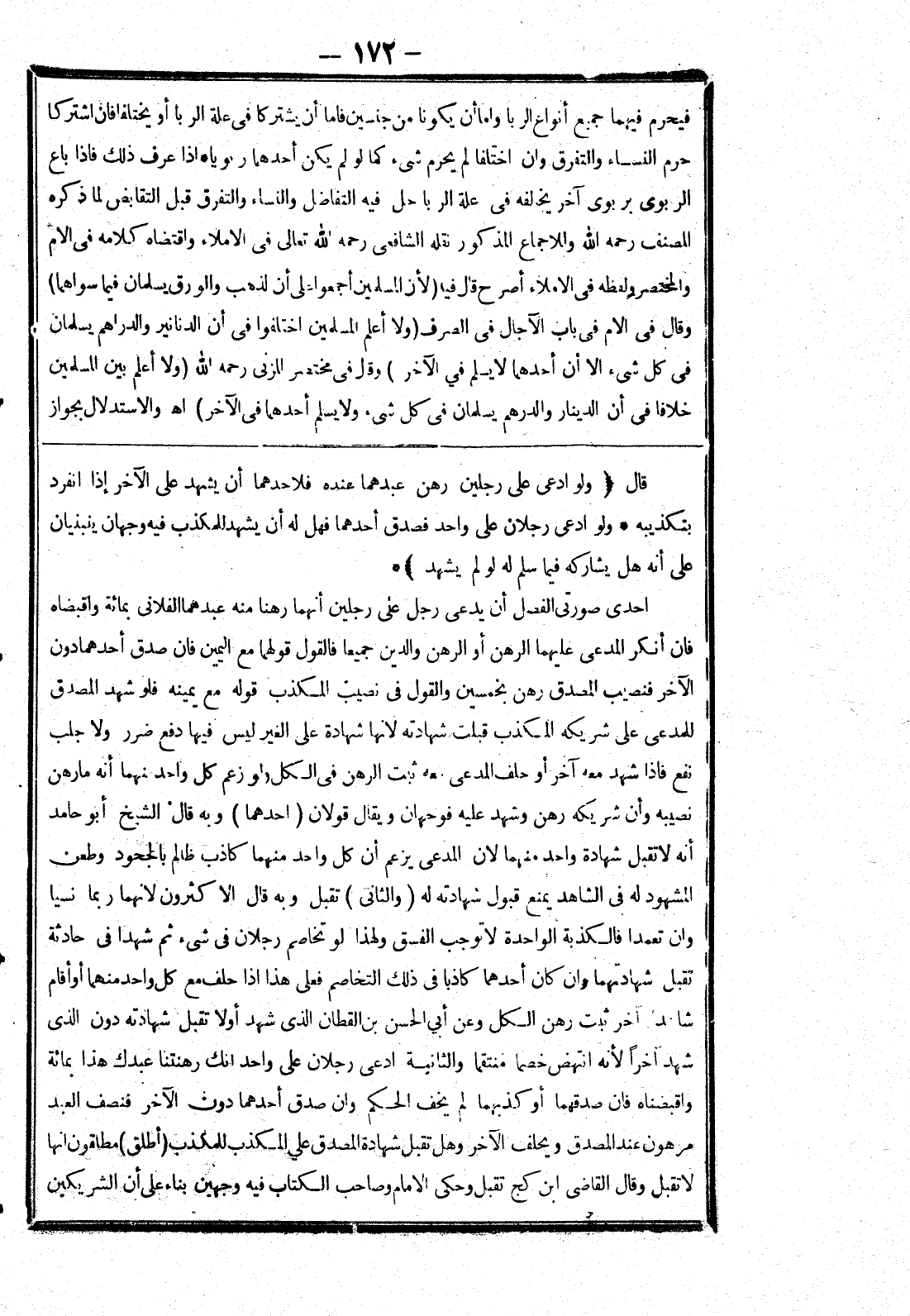 الآخر فنصيب المصدق رهن بخمسين والقول في نصيب المكذب قوله مع يمينه فلو شهد المصدق للمدعى على شريكه المكذب قبلت شهادته لانها شهادة على الغير ليس فيها دفع ضرر ولاجلب نفع فإذا شهد معه آخر أو حلف المدعى معه ثبت الرهن في الكل ولو زعم كل واحد منهما أنه ما رهن نصيبه وأن شريكه رهن وشهد عليه فوجهان ويقال قولان (احدهما) وبه قال الشيخ أبو حامد أنه لاتقبل شهادة واتحد منهما لان المدعى يزعم أن كل واحد منهما كاذب ظالم بالجحود وطعن المشهود له في الشاهد يمنع قبول شهادته له (والثانى) تقبل وبه قال الاكثرون ولانهما ربما نسيا وان تعمدا فالكذبة الواحدة لا توجب الفسق ولهذا لو تخاصم رجلان في شئ ثم شهدا في حادثة تقبل شهادتهما وان كان أحدهما كاذبا في ذلك التخاصم فعلى هذا إذا حلف مع كل واحد منهما أو أقام شاهد آخر ثبت رهن الكل وعن أبي الحسن بن القطان الذى شهد أولا تقبل شهادته دون أن الذي شهد آخرا لانه انتهض خصما منتقما والثانية ادعى رجلان على واحد انك رهنتنا عبدك هذا بمائة واقبضناه فان صدقهما أو كذبهما لم يخف الحكم وان صدق أحدهما دون الآخر فنصف العبد مرهون عند المصدق ويحلف الآخر وهل تقبل شهادة المصدق علي المكذب للمكذب (أطلق) مطلقون انها لاتقبل وقال القاضى ابن كج تقبل وحكى الامام وصاحب الكتاب فيه وجهين بناء على أن الشريكين