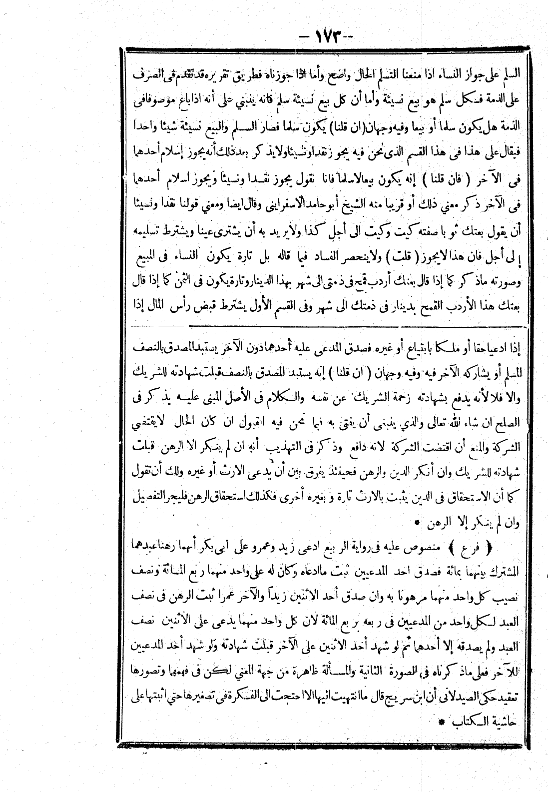 (فرع) منصوص عليه في رواية الربيع ادعى زيد وعمرو على ابى بكر أنهما رهنا عبدهما المشترك بينهما بمائة فصدق احد المدعيين ثبت ما ادعاه وكان له على كل واحد منهما ربع المائة ونصف نصيب كل واحد منهما مرهونا به وان صدق أحد الاثنين زيدا والآخر عمرا تبت الرهن في نصف العبد لكل واحد من المدعيين في ربعه فربع المائة لان كل واحد منهما يدعى على الاثنين نصف العبد ولم يصدقه إلا أحدهما ثم لو شهد أحد الاثنين على الآخر قبلت شهادته ولو شهد أحد المدعيين للآخر فعلى ما ذكرناه في الصورة الثانية والمسألة ظاهرة من جهة المعني لكن في فهمهما وتصورها تعقيد حكى الصيدلانى أن ابن سريج قال ما انتهيت إليها الا احتجت إلى الفكرة في تصورها حتى اثبتها على حاشية الكتاب *