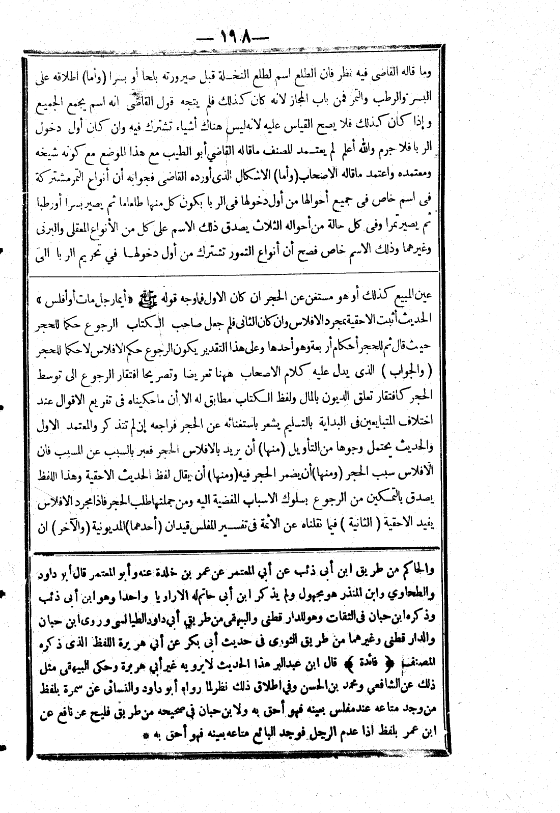 عين المبيع كذلك أو هو مستغن عن الحجر ان كان الاول فما وجه قوله صلى الله عليه وسلم (أيما رجل مات أو أفلس) الحديث أثبت الاحقية بمجرد الافلاس وان كان الثاني فلم جعل صاحب الكتاب الرجوع حكما للحجر حيث قال ثم للحجر أحكام أربعة وهو أحدها وعلى هذا التقدير يكون الرجوع حكم الافلاس لا حكما للحجر (والجواب) الذى يدل عليه كلام الاصحاب ههنا تعريضا وتصريحا افتقار الرجوع إلى توسط الحجر كافتقار تعلق الديون بالمال ولفظ الكتاب مطابق له الا أن ما حكيناه في تفريع الاقوال عند اختلاف المتبايعين في البداية بالتسليم يشعر باستغنائه عن الحجر فراجعه إن لم تتذكر والمعتمد الاول والحديث يحتمل وجوها من الاأويل (منها) أن يريد بالافلاس الحجر فعبر بالسبب عن المسبب فان