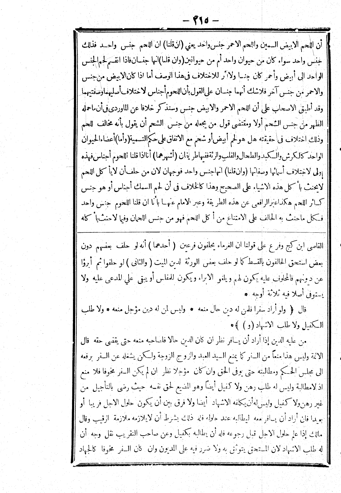 الكفيل ولا طلب الاشهاد (و) * من عليه الدين إذا أراد أن يسافر نظر ان كان الدين حالا فلصاحبه منعه حتى يقضى حقه قال الائمة وليس هذا منعا من السفر كما يمنع السيد العبد والزوج الزوجة ولكن يشغله عن السفر برفعه إلى مجلس الحكم ومطالبته حتى يوفى الحق وان كان مؤجلا نظر ان لم يكن السفر مخوفا فلا منع إذ لا مطالبة وليس له طلب رهن ولا كفيل أيضا وهو المضيع لحق نفسه حيث رضى بالتأجيل من غير رهن ولا كفيل وليس له أن يكلفه الاشهاد أيضا ولا فرق بين أن يكون حلول الاجل قريبا أو بعيدا فان أراد أن يسافر معه ليطالبه عند حلوله فله ذلك بشرط أن لا يلازمه ملازمة الرقيب وقال مالك إذا علم حلول الاجل قبل رجوعه فله أن يطالبه بكفيل وعن صاحب التقريب نقل وجه أن له طلب الاشهاد لان المستحق يتوثق به ولا ضرر فيه على المديون وان كان السفر مخوفا كالجهاد