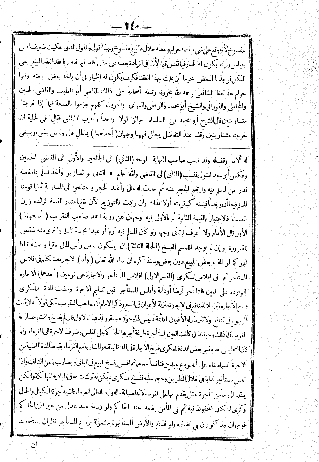 له ألاما وقف له وقد نسب صاحب النهاية الوجه (الثاني) إلى الجماهير والاول إلى القاضى الحسين وعكس أبو سعد المتولي فنسب (الثاني) إلى القاضى والله أعلم * الثاني لو تضاربوا وأخذ المسلم بما خصه قدرا من المسلم فيه وارتفع الحجر عنه ثم حدث له مال وأعيد الحجر واحتاجوا إلى المضاربة ثانيا قومنا المسلم فيه فأن وجدنا كقيمته أولا فذاك وان زادت فالتوزيع الآن يقع باعتبار القيمة الزائدة وإن نقصت فالاعتبار بالقيمة الثانية أم بالاولى فيه وجهان عن رواية صاحب التقريب (أصحهما) الاول قال الامام ولا أعرف للثاني وجها ولو كان المسلم فيه ثوبا أو عبدا بحصة المسلم يشترى منه شقص للضرورة وإن لم يوجد فللمسلم الفسخ (الحالة الثالثة) ان يكون بعض رأس المال باقيا وبعضه تالفا فهو كما لو تلف بعض المبيع دون بعض وسنذكره ان شاء الله تعالى (وأما) الاجارة فنتكلم في افلاس المستأجر ثم في افلاس المكرى (القسم الاول) افلاس المستأجر والاجارة على نوعين (أحدهما) الاجارة الواردة على العين فإذا اجر أرضا أو دابة وأفلس الستأجر قبل تسليم الاجرة ومضت المدة فللمكرى فسخ الاجارة تنزيلا للمنافع في الاجارة منزلة الاعيان في البيع وذكر الامام أن صاحب التقريب حكى قولا أنه لا يثبت الرجوع في المنافع تترك منزلة الاعيان القائمة إذ ليس لها وجود مستقر والمذهب الاول فان لم يفسخ واختار مضاربة الغرماء فله ذلك وحيئنذ ان كانت العين المستأجرة فارغة أجرها الحاكم على المفلس وصرف الاجرة إلى الغرماء ولو كان التفليس بعد مضى بعض المدة فللمكرى فسخ الاجارة في المدة الباقية والمضاربة مع الغرماء بقسط المدة الماضية من الاجرة المسماة بناء على أنه لو باع عبدين فتلف أحدهما ثم افلس يفسخ البيع في الباقي ويضارب بثمن التالف وإذا افلس مسأجر الدابة في خلال الطريق وحجر عليه ففسخ المكرى لم يكن له ترك متاعه في البادية المهلكة ولكن