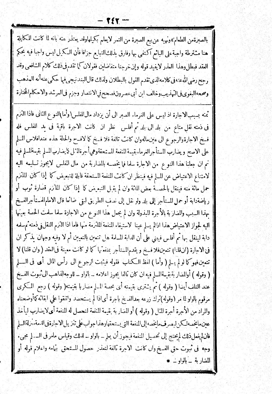 ثمنه بسبب الاجاره إذ ليس على الغرماء الصبر إلى أن يزداد مال المفلس (وأما) النوع الثاني فإذا التزم في ذمته نقل متاع من بلد إلى بلد ثم أفلس نظر ان كانت الاجرة باقية في يد المفلس فله فسخ الاجارة والرجوع إلى عين ماله وان كانت تالفة فلا فسخ كما لا فسخ والحالة هذه عند افلاس المسلم إليه على الاصح ويضارب المستأجر الغرماء بقيمة المنفعة المستحقة وهي أجرة المثل كما يضارب المسلم بقيمة المسلم فيه ثم ان جعلنا هذا النوع من الاجارة سلما فما يخصه بالمضاربة من مال المفلس لا يجوز تسليمه إليه لامتناع الاعتياض عن المسلم فيه فينظر ان كانت المنفعة المستحقة قابلة للتبعيض كما إذا كان الملتزم حمل مائة من فينقل بالحصة بعض المائة وان لم يقبل التبعيض كما إذا كان الملتزم قصارة ثوب أو رياضة دابة أو حمل المستأجر إلى بلد ولو نقل إلى نصف الطريق لبقى ضائعا قال الامام للمستأجر الفسخ بهذا السبب والمضاربة بالاجرة المبذولة وان لم يجعل هذا النوع من الاجارة سلما سلمت الحصة بعينها إليه لجواز الاعتياض هذا إذا لم يسلم عينا لاستيفاء المنفعة الملتزمة منها فاما إذا التزم النقل في ذمته ثم سلمه دابة لينقل بها ثم أفلس فيبني على أن الدابة المسلمة هل تتعين بالتعيين أم لا وفيه وجهان يذكران في الاجاره (ان قلنا) تتعين فلا فسخ ويقدم المستأجر بمنفعتها كما لو كانت معينه في العقد (وان قلنا) لا تتعين فهو كما لو لم يسلم (وأما) لفظ الكتاب فقوله فيثبت الرجوع إلى رأس المال أي في السلم (وقوله) أو المضاربة بقيمة المسلم في ان كان تالفا يجوز اعلامه بالواو للوجه الذاهب إلى ثبوت الفسخ عند التلف أيضا (وقوله) ثم يشترى بقيمته أي بحصة المسلم مضاربا بقيمته (وقوله) رجع المكرى مرقوم بالواو بالواو لما مر (وقوله) ترك زرعه بعد الفسخ باجرة أي إذا لم يستحصد واتفقوا على ابقائه كما أوضحناه والمراد من الاجرة أجرة المثل (وقوله) أو المضاربة بقيمة المنفعة لتحصل له المنفعة أي لا يضارب ليأخذ عين ما يخصه لكن ليصرف ما يخصه إلى المنفعة التى يستحقها وهذا جواب على تنزيل الاجارة في الذمة منزلة السلم فان لم يفعل ذلك لم يحتج إلى تحصيل المنفعة فيجوز أن يعلم بالواو لذلك وقياس ما مر في السلم مجئ