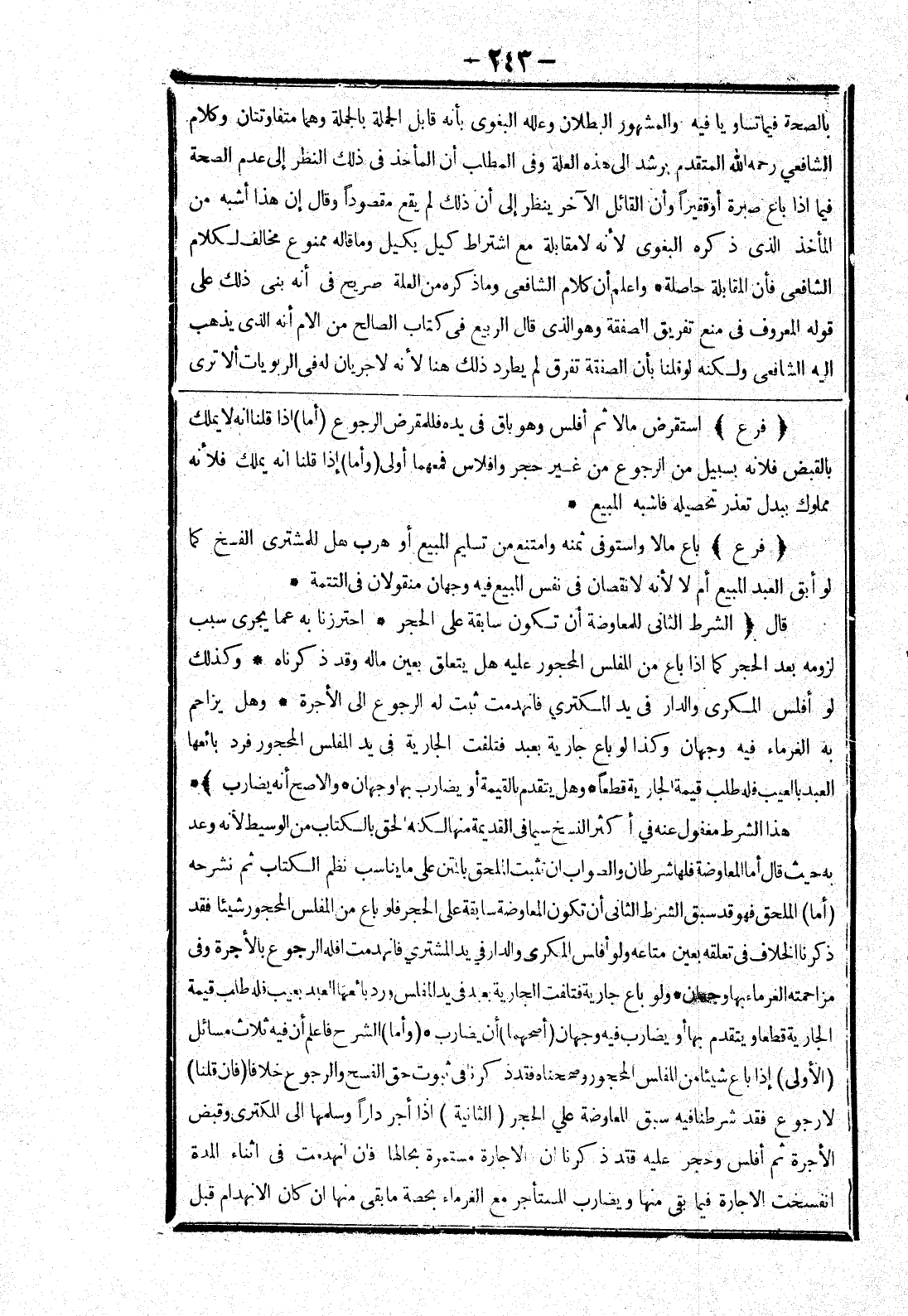 (فرع) استقرض مالا ثم أفلس وهو باق في يده فللمستقرض الرجوع (أما) إذا قلنا انه لا يملك بالقبض فلانه بسبيل من الرجوع من غير حجر وافلاس فمعهما أولى (وأما) إذا قلنا انه يملك فلانه مملوك ببدل تعذر تحصيله فاشبه المبيع * (فرع) باع مالا واستوفى ثمنه وامتنع من تسليم المبيع أو هرب هل للمشترى الفسخ كما لو أبق العبد المبيع أم لا لانه لا نقصان في نفس المبيع فيه وجهان منقولان في التتمة * قال (الشرط الثاني للمعارضة أن تكون سابقة على الحجر * احترزنا به عما يجرى سبب لزومه بعد الحجر كما إذا باع المفلس المحجور عليه هل يتعلق بعين ماله وقد ذكرناه * وكذلك لو أفلس المكرى والدار في يد المكتري فانهدمت ثبت له الرجوع إلى الاجرة * وهل يزاحم به الغرماء فيه وجهان وكذا لو باع جارية بعبد فتلفت الجارية في يد المفلس المحجور فرد بائعها العبد بالعيب فله طلب قيمة الجارية قطعا * وهل يتقدم بالقيمة أو يضارب بها وجهان * والاصح أنه يضارب) * هذا الشرط مغفول عنه في أكثر النسخ سيما في القديمة منها لكنه الحق بالكتاب من الوسيط لانه وعد به حيث قال أما المعاوضة فلها شرطان والصواب ان تثبت الملحق بالمتن على ما يناسب نظم الكتاب ثم نشرحه (أما) الملحق فهو قد سبق الشرط الثاني أن تكون المعاوضة سابقة على الحجر فلو باع من المفلس المحجور شيئا فقد ذكرنا الخلاف في تعلقه بعين متاعه ولو أفلس المكرى والدار في يد المشتري فانهدمت افله الرجوع بالاجرة وفى مزاحمته الغرماء بها وجهان * ولو باع جارية بعبد فتلفت في يد المفلس ورد بائعها العبد بعيب فله طلب قيمة الجارية قطعا ويتقدم بها أو يضارب فيه وجهان (أصحهما) أن يضارب * (وأما) الشرح فاعلم أن فيه ثلاث مسائل (الاولى) إذا باع شيئا من المفلس المحجور وصححناه فقد ذكرنا في ثبوت حق الفسح والرجوع خلافا (فان قلنا) لا رجوع فقد شرطنا فيه سبق المعاوضة على الحجر (الثانية) إذا أجر دارا وسلمها إلى المكترى وقبض الاجرة ثم أفلس وحجر عليه فقد ذكرنا ان الاجارة مستمرة بحالها فان انهدمت في اثناء المدة