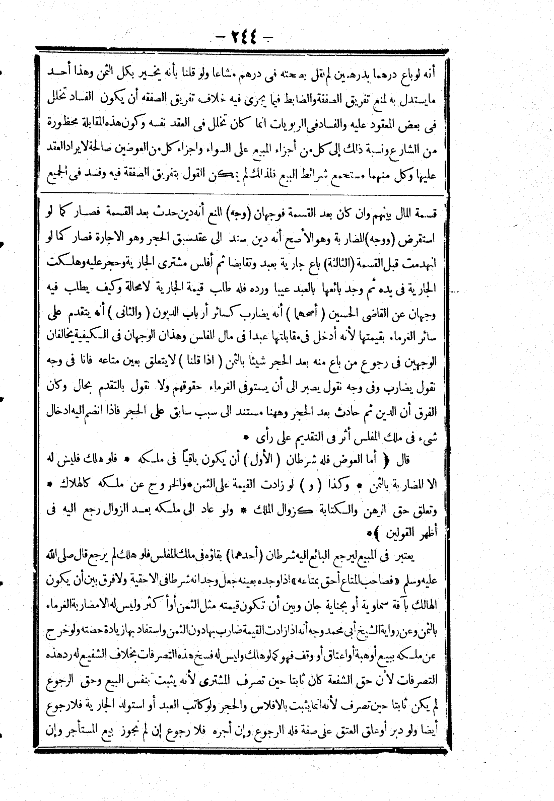 قسمة المال بينهم وان كان بعد القسمة فوجهان (وجه) المنع أنه دين حدث بعد القسمة فصار كما لو استقرض (ووجه) المضاربة وهو الاصح أنه دين أسند إلى عقد سبق الحجر وهو الاجارة فصار كما لو انهدمت قبل القسمة (الثالثة) باع جارية بعبد وتقابضا ثم أفلس مشترى الجارية وحجر عليه وهلكت الجارية في يده ثم وجد بائعها بالعبد عيبا ورده فله طلب قيمة الجارية لا محالة وكيف يطلب فيه وجهان عن القاضى الحسين (أصحهما) أنه يضارب كسائر أرباب الديون (والثانى) أنه يتقدم على سائر الغرماء بقيمتها لانه أدخل في مقابلتها عبدا في مال المفلس وهذان الوجهان في الكيفية يخالفان الوجهين في رجوع من باع منه بعد الحجر شيئا بالثمن (إذا قلنا) لا يتعلق بعين متاعه فانا في وجه نقول يضارب وفى وجه نقول يصير إلى أن يستوفى الغرماء حقوقهم ولا نقول بالتقدم بحال وكان الفرق أن الدين ثم حادث بعد الحجر وههنا مستند إلى سبب سابق على الحجر فإذا انضم إليه ادخال شئ في ملك المفلس أثر في التقديم على رأى * قال (أما العوض فله شرطان (الاول) أن يكون باقيا في ملكه * فلو هلك فليس له الا المضاربة بالثمن * وكذا (و) لو زادت القيمة على الثمن * والخروج عن ملكه كالهلاك * وتعلق حق الرهن والكتابة كزوال الملك * ولو عاد إلى ملكه بعد الزوال رجع إليه في أظهر القولين) * يعتبر في المبيع ليرجع البائع إليه شرطان (أحدهما) بقاؤه في ملك المفلس فلو هلك لم يرجع قال صلى الله عليه وسلم (فصاحب المتاع أحق بمتاعه) إذا وجده بعينه جعل وجدانه شرطا في الاحقية ولا فرق بين أن يكون الهالك بآفة سماوية أو يجناية جان وبين أن تكون قيمته مثل الثمن أو أكثر وليس له الا مضاربة الغرماء بالثمن وعن رواية الشيخ أبى محمد وجه أنه إذا زادت القيمة ضارب بها دون الثمن واستفاد بها زيادة حصته ولو خرج عن ملكه ببيع أو هبة أو اعتاق أو وقف فهو كما لو هلك وليس له فسخ هذه التصرفات بخلاف الشفيع له رد هذه التصرفات لان حق الشفعة كان ثابتا حين تصرف المشترى لانه يثبت بنفس البيع وحق الرجوع