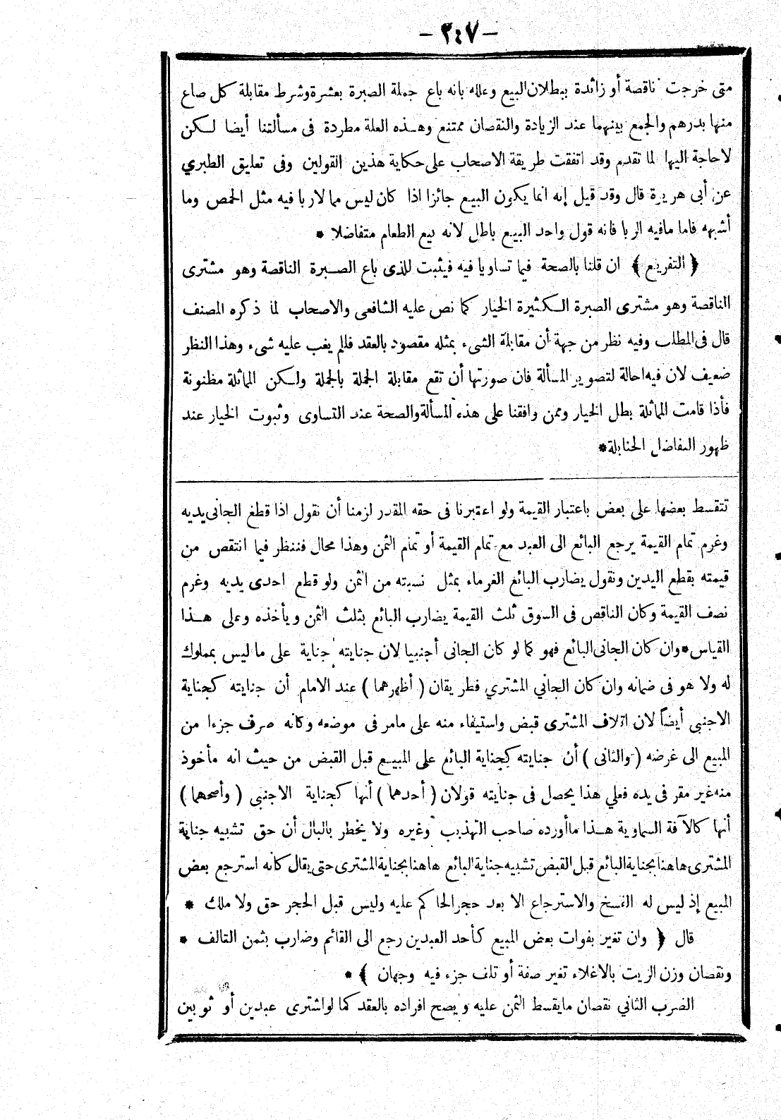 تتقسط بعضها على بعض باعتبار القيمة ولو اعتبرنا في حقه المقدر لزمنا أن نقول إذا قطع الجاني يديه وغرم تمام القيمة يرجع البائع إلى العبد مع تمام القيمة أو تمام الثمن وهذا محال فننظر فيما انتقص من قيمته بقطع اليدين ونقول يضارب البائع الغرماء بمثل نسبته من الثمن ولو قطع احدى يديه وغرم نصف القيمة وكان الناقص في السوق ثلث القيمة يضارب البائع بثلث الثمن ويأخذه وعلى هذا القياس * وان كان الجاني البائع فهو كما لو كان الجاني أجنبيا لان جنايته جناية على ما ليس بمملوك له ولا هو في ضمانه وان كان الجاني المشترى فطريقان (أظهرهما) عند الامام أن جنايته كجناية الأجنبي أيضا لان اتلاف المشترى قبض واستيفاء منه على ما مر في موضعه وكانه صرف جزءا من المبيع إلى غرضه (والثانى) أن جنايته كجناية البائع على المبيع قبل القبض من حيث انه مأخوذ منه غير مقر في يده فعلى هذا يحصل في جنايته قولان (أحدهما) أنها كجناية الأجنبي (وأصحهما) أنها كالآفة السماوية هذا ما أورده صاحب التهذيب وغيره ولا يخطر بالبال أن حق تشبيه جناية المشترى هاهنا بجناية البائع قبل القبض تشبيه جناية البائع هاهنا بجناية المشترى حتى يقال كانه استرجع بعض المبيع إذ ليس له الفسخ والاسترجاع الا بعد حجر الحاكم عليه وليس قبل الحجر حق ولا ملك * قال (وان تغير بفوات بعض المبيع كاحد العبدين رجع إلى القائم وضارب بثمن التالف * ونقصان وزن الزيت بالاغلاء تغير صفة أو تلف جزء فيه وجهان) * الضرب الثاني نقصان ما يقسط الثمن عليه ويصح افراده بالعقد كما لو اشترى عبدين أو ثوبين