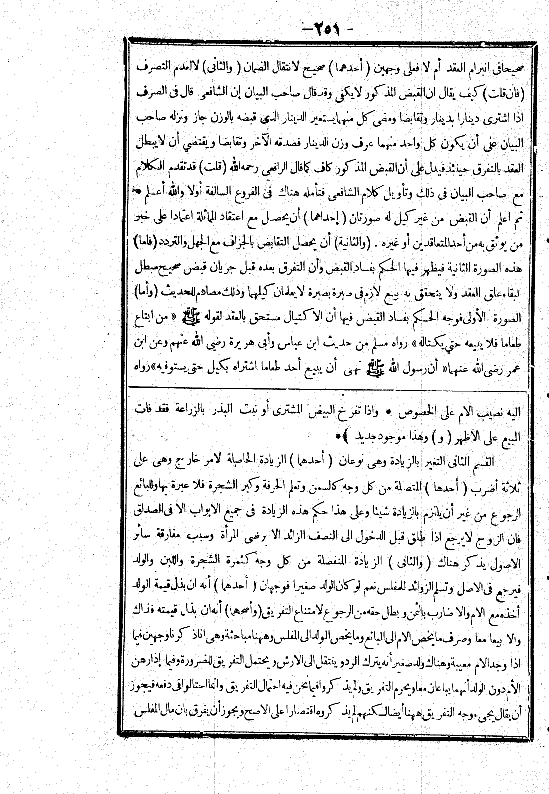 إليه نصيب الام على الخصوص * وإذا تفرخ البيض المشترى أو نبت البذر بالزراعة فقد فات المبيع على الاظهر (و) وهذا موجود جديد) * القسم الثاني التغير بالزيادة وهي نوعان (أحدهما) الزيادة الحاصلة لامر خارج وهي على ثلاثة أضرب (أحدها) المتصلة من كل وجه كالسمن وتعلم الحرفة وكبر الشجرة فلا عبرة بها وللبائع الرجوع من غير أن يلتزم بالزيادة شيئا وعلى هذا حكم هذه الزيادة في جميع الابواب الا في الصداق فان الزوج لا يرجع إذا طلق قبل الدخول إلى النصف الزائد الا برضى المرأة وسبب مفارقة سائر الاصول يذكر هناك (والثاني) الزيادة المنفصلة من كل وجه كثمرة الشجرة واللبن والولد فيرجع في الاصل وتسلم الزوائد للمفلس نعم لو كان الولد صغيرا فوجهان (أحدهما) أنه ان بذل قيمة الولد أخذه مع الام والا ضارب بالثمن وبطل حقه من الرجوع لامتناع التفريق (وأصحهما) أنه ان بذل قيمته فذاك والا بيعا معا وصرف ما يخص الام إلى البائع وما يخص الولد المفلس وههنا مباحثة وهي انا ذكرنا وجهين فيما إذا وجد الام معيبة وهناك ولد صغيرا أنه يترك الرد وينتقل إلى الارش ويحتمل التفريق للضرورة وفيما إذا رهن الام دون الولد أنهما يباعان معا ويحرم التفريق ولم يذكروا فيما نحن فيه احتمال التفريق وانما احتالوا في دفعه فيجوز أن يقال يجئ وجه التفريق ههنا أيضا لكنهم لم يذكروه اقتصارا على الاصح ويجوز أن يفرق بان مال المفلس