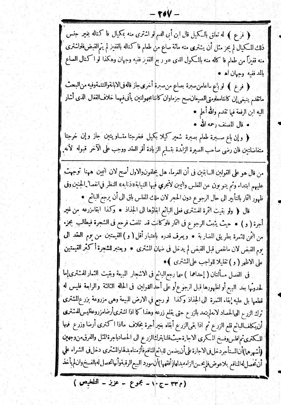 من قال هو على القولين السابقين في أن الغرماء هل يحلفون والاول أصح لان اليمين ههنا توجهت عليهم ابتداء وثم ينوبون عن المفلس واليمين لا تجري فيها النيابة (ذنابه) النظر في انفصال الجنين وفى ظهور الثمار بالتأبير إلى حال الرجوع دون الحجر لان ملك المفلس باق إلى أن يرجع البائع * قال (ولو بقيت الثمرة للمشترى فعلى البائع ابقاؤها إلى الجذاذ * وكذا ابقاء زرعه من غير أجرة (و) * حيث يثبت الرجوع في الثمار فلو كانت قد تلفت فرجع في الشجرة فيطالب بجزء من الثمن للثمرة بطريق المضاربة * ويعرف قدره باعتبار أقل (و) القيمتين من يوم العقد إلى يوم القبض لان ما نقص قبل القبض لم يدخل في ضمان المشترى * ويعتبر للشجرة أكثر القيمتين على الاظهر (و) تقليلا للواجب على المشترى) * في الفصل مسألتان (إحداهما) مهما رجع البائع في الاشجار المبيعة وبقيت الثمار للمشترى إما لحدوثها بعد البيع أو لظهورها قبل الرجوع أو على أحد القولين في الحالة الثالثة والرابعه فليس له