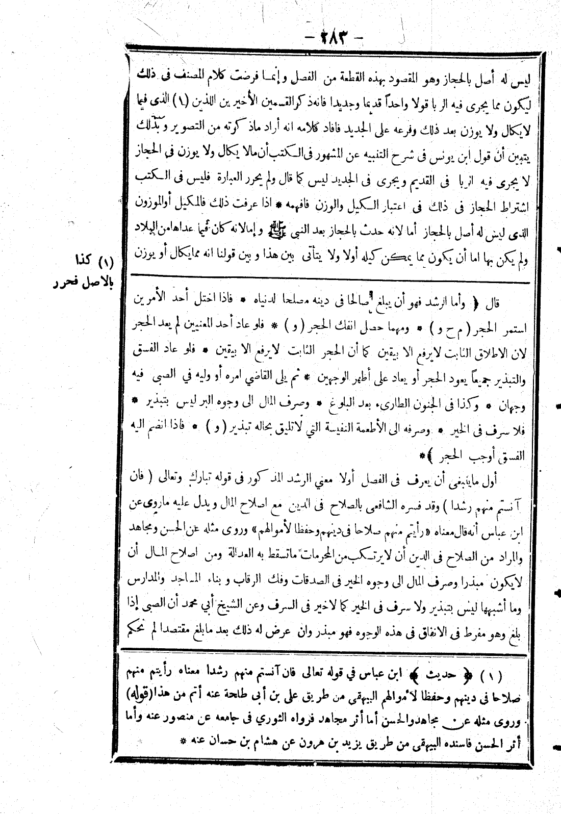 أول ما ينبغى أن يعرف في الفصل أولا معني الرشد المذكور في قوله تبارك وتعالى (فان آنستم منهم رشدا) وقد فسره الشافعي بالصلاح في الدين مع اصلاح المال ويدل عليه ما روى عن ابن عباس أنه قال معناه (رأيتم منهم صلاحا في دينهم وحفظا لاموالهم) وروى مثله عن الحسن ومجاهد والمراد من الصلاح في الدين أن لا يرتكب من المحرمات ما تسقط به العدالة ومن اصلاح المال أن لا يكون مبذرا وصرف المال إلى وجود الخير في الصدقات وفك الرقاب وبناء المساجد والمدارس وما أشبهها ليس بتبذير ولا سرف في الخير كما لا خير في السرف وعن الشيخ أبى محمد أن الصبى إذا بلغ وهو مفرط في الانفاق في هذه الوجوه فهو مبذر وان عرض له ذلك بعد ما بلغ مقتصدا لم نحكم