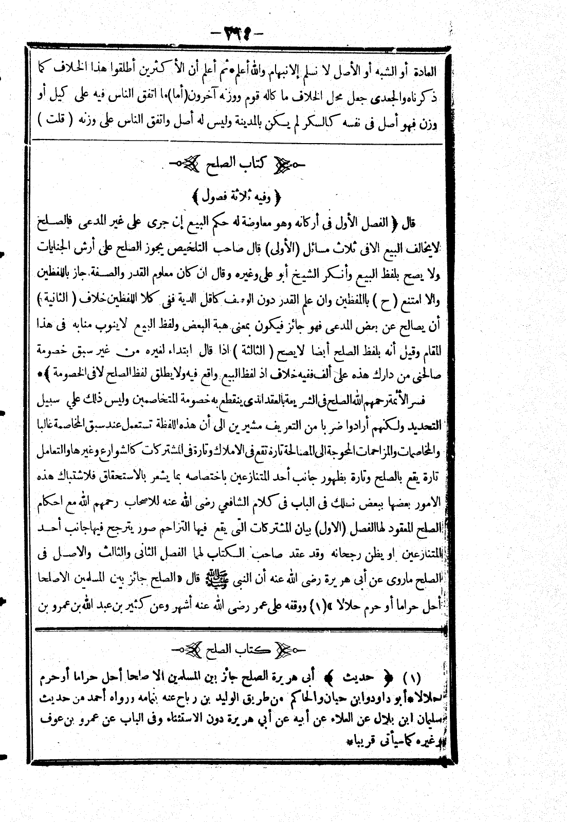 والا امتنع (ح) باالمفظين وان علم القدر دون الوصف كاقل الدية ففى كلا اللفظين خلاف (الثانية) أن يصالح عن بعض المدعى فهو جائز فيكون بمعنى هبة البعض ولفظ البيع لا ينوب منابه في هذا المقام وقيل أنه بلفظ الصلح أيضا لا يصح (الثالثة) إذا قال ابتداء لغيره من غير سبق خصومة صالحني من دارك هذه على ألف ففيه خلاف إذ لفظ البيع واقع فيه ولا يطلق لفظ الصلح لافى الخصومة) * فسر الائمة رحمهم الله الصلح في الشريعة بالعقد الذى ينقطع به خصومة المتخاصمين وليس ذلك على سبيل التحديد ولكنهم أردوا ضربا من التعريف مشيرين إلى أن هذه اللفظة تستعمل عند سبق المخاصمة غالبا والمخاصمات والمزاحمات المحوجة إلى المصالحة تارة تقع في الاملاك وتارة في المشتركات كالشوارع وغيرها والتعامل تارة يقع بالصلح وتارة بظهور جانب أحد المتنازعين باختصاصه بما يشعر بالاستحقاق فلا شتباك هذه الامور بعضها ببعض نسلك في الباب في كلام الشافعي رضى الله عنه للاصحاب رحمهم الله مع احكام الصلح المعقود لها الفصل (الاول) بيان المشتركات التى يقع فيها التزاحم صور يترجح فيها جانب أحد المتنازعين أو يظن رجحانه وقد عقد صاحب الكتاب لهما الفصل الثاني والثالث والاصل في الصلح ماروى عن أبى هريرة رضى الله عنه أن النبي صلى الله عليه وسلم قال (الصلح جائز بين المسلمين الاصلحا أحل حراما أو حرم حلالا) ووقفه على عمر رضى الله عنه اشهر وعن كثير بن عبد الله بن عمرو بن