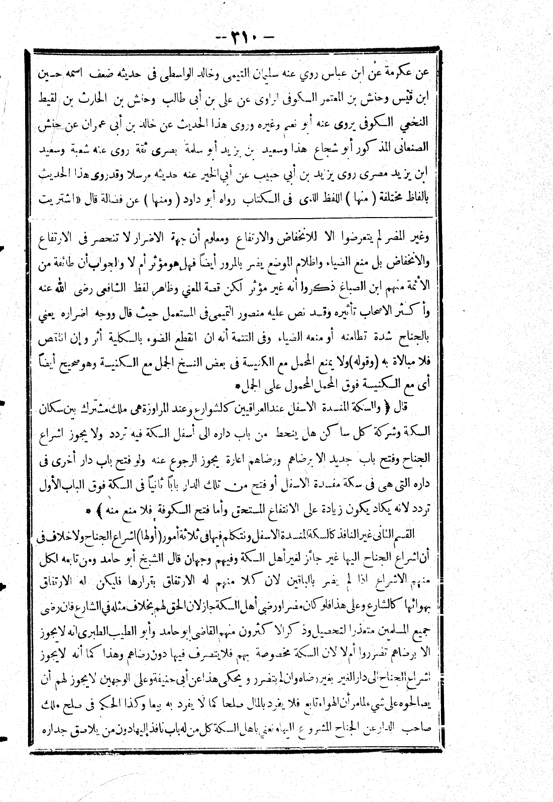 والانخفاض بل منع الضياء واظلام الموضع يضر بالمرور أيضا فهل هو مؤثر أم لا والجواب أن طائفة من الائمة منهم ابن الصباغ ذكروا أنه غير مؤثر لكن قضية المعني وظاهر لفظ الشافعي رضى الله عنه وأكثر الاصحاب تأثيره وقد نص عليه منصور التميمي في المستعمل حيث قال ووجه اضراره يعني الجناح شدة تطامنه أو منعه الضياء وفى التتمة أنه ان انقطع الضوء بالكلية أثر وإن انتقص فلا مبالاة به (وقوله) ولا يمنع المحمل مع الكنيسة في بعض النسخ الجمل مع الكنيسة وهو صحيح أيضا أي مع الكنيسة فوق المحمل المحمول على الجمل * قال (والسكة المنسدة الاسفل عند العراقيين كالشوارع وعند المراوزة هي ملك مشترك بين سكان السكة وشركة كل ساكن هل ينحط من باب داره إلى أسفل السكة فيه تردد ولا يجوز اشراع الجناح وفتح باب جديد الا برضاهم ورضاهم اعارة يجوز الرجوع عنه ولو فتح باب دار أخرى في داره التى هي في سكة مفسدة الاسفل أو فتح من تلك الدار بابا ثانيا في السكة فوق الباب الاول تردد لانه يكاد يكون زيادة على الانتفاع المستحق وأما فتح السكوفة فلا منع منه) * القسم الثاني غير النافذ كالسكة المنسدة الاسفل ونتكلم فيها في ثلاثة أمور (أولها) اشراع الجناح ولا خلاف في أن اشراع الجناح إليها غير جائز لغير أهل السكة وفيهم وجهان قال الشيخ أبو حامد ومن تابعه لكل منهم الاشراع إذا لم يضر بالباقين لان كلا منهم له الارتفاق بقرارها فليكن له الارتفاق بهوائها كالشارع وعلى هذا فلو كان مضرا ورضى أهل السكة جاز لان الحق لهم بخلاف مثله في الشارع فان رضى جميع المسلمين متعذرا لتحصيل وذكرا لاكثرون منهم القاضى ابو حامد وأبو الطيب الطبري انه لا يجوز الا برضاهم تضرروا أم لا لان السكة مخصوصة بهم فلا يتصرف فيها دون رضاهم وهذا كما أنه لا يجوز اشراع الجناح إلى دار الغير رضاه وان لم يتضرر ويحكى هذا عن أبى حنيفة وعلى الوجهين لا يجوز لهم أن يصالحوه على شئ لما مر أن الهواء تابع فلا يفرد بالمال صلحا كما لا يفرد به بيعا وكذا الحكم في صلح ملك صاحب الدار عن الجناح المشروع إليها ونعني باهل السكة كل من له باب نافذ إليها دون من يلاصق جداره