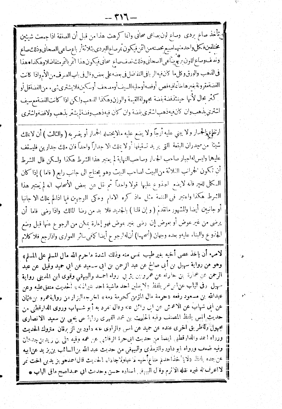 لامرء أن ياخذ عصى أخيه بغير طيب نفس منه وذلك لشدة ما حرم الله مال المسلم على المسلم " وهو من رواية سهبل بن أبى صالح عن عبد الرحمن بن ابى سعيد عن ابى حميد وقيل عن عبد الرحمن عن عمارة بن حارثة عن عمر وبن يثربى رواه احمد والبيهقي وقوى ابن المدينى رواية سهيل وفي الباب عن ابن عمر بلفظ (لا يحلبن احد ماشية احد بغير اذنه) الحديث متفق عليه وعن