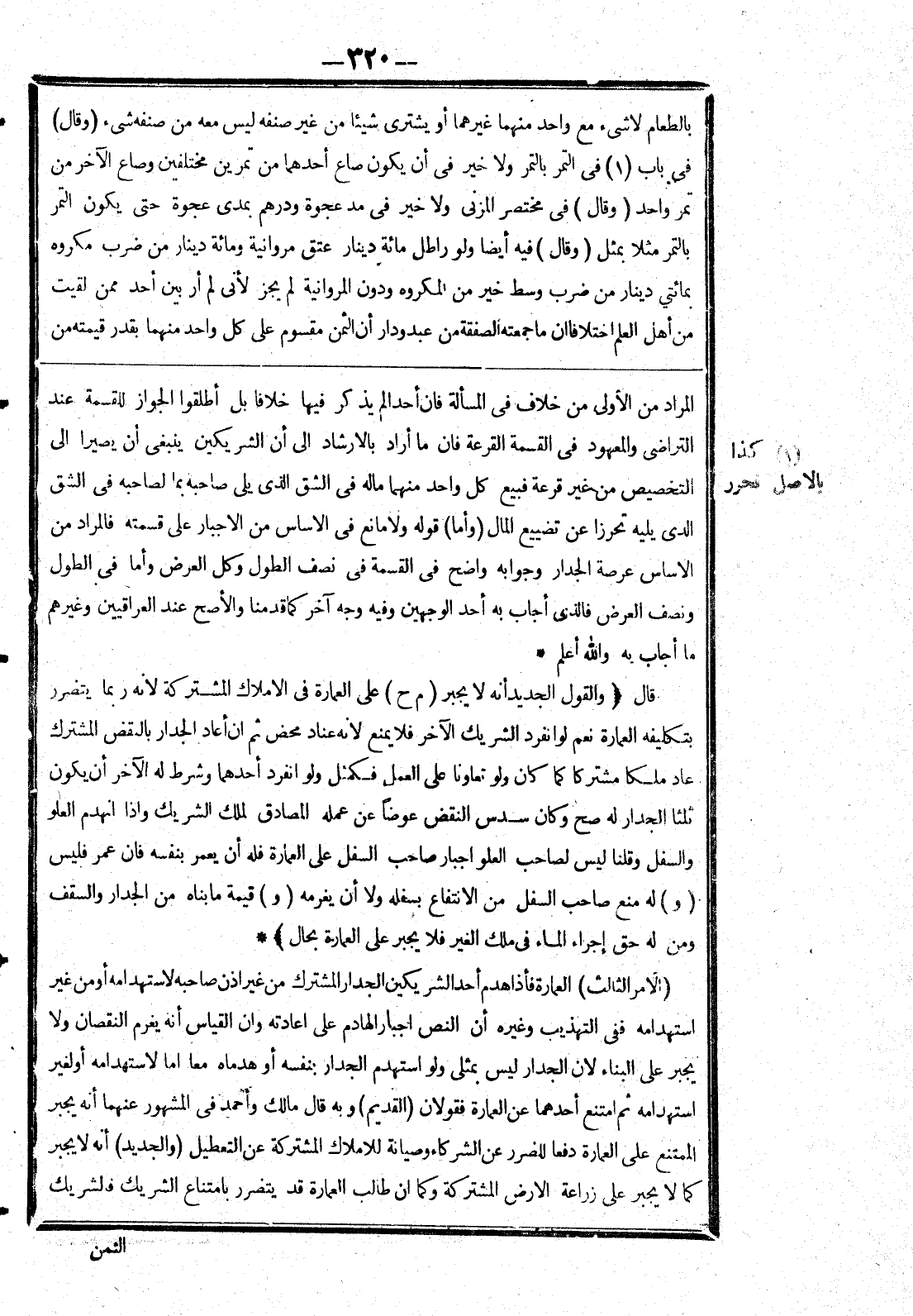 المراد من الاولى من خلاف في المسألة فان أحدا لم يذكر فيها خلافا بل أطلقوا الجواز للقسمة عند التراضي والمعود في القسمة القرعة فان ما أراد الارشاد إلى أن الشريكين ينبغى أن يصيرا إلى التخصيص من غير قرعة فبيع كل واحد منهما ماله في الشق الذى يلى صاحبه بما لصاحبه في الشق الذى يليه تحرزا عن تضييع المال (وأما) قوله ولا مانع في الاساس من الاجبار على قسمته فالمراد من الاساس عرصة الجدار وجوابه واضح في القسمة في نصف الطول وكل العرض وأما في الطول ونصف العرض فالذي أجاب به احد الوجهين وفيه وجه آخر كما قدمنا والاصح عند العراقيين وغيرهم ما أجاب به والله أعلم * قال (والقول الجديد أنه لا يجبر (م ح) على العمارة في الاملاك المشتركة لانه ربما يتضرر بتكليفه العمارة نعم لو انفرد الشريك الآخر فلا يمنع لانه عناد محض ثم ان أعاد الجدار بالنقض المشترك عاد ملكا مشتركا كما كان ولو تعاونا على العمل فكمثل ولو انفرد أحدهما وشرط له الآخر أن يكون ثلثا الجدار له صح وكان سدس النقض عوضا عن عمله المصادق لملك الشريك وإذا انهدم العلو والسفل وقلنا ليس لصاحب العلو اجبار صاحب السفل على العمارة فله أن يعمر بنفسه فان عمر فليس (و) له منع صاحب السفل من الانتفاع بسفله ولا أن يغرمه (و) قيمة ما بناه من الجدار والسقف ومن له حق إجراء الماء في ملك الغير فلا يجبر على العمارة بحال) * (الامر الثالث) العمارة فأذا هدم أحد الشريكين الجدار المشترك من غير اذن صاحبه لاستهدامه أو من غير استهدامه ففى التهذيب وغيره أن النص اجبار الهادم على اعادته وان القياس أنه يغرم النقصان ولا