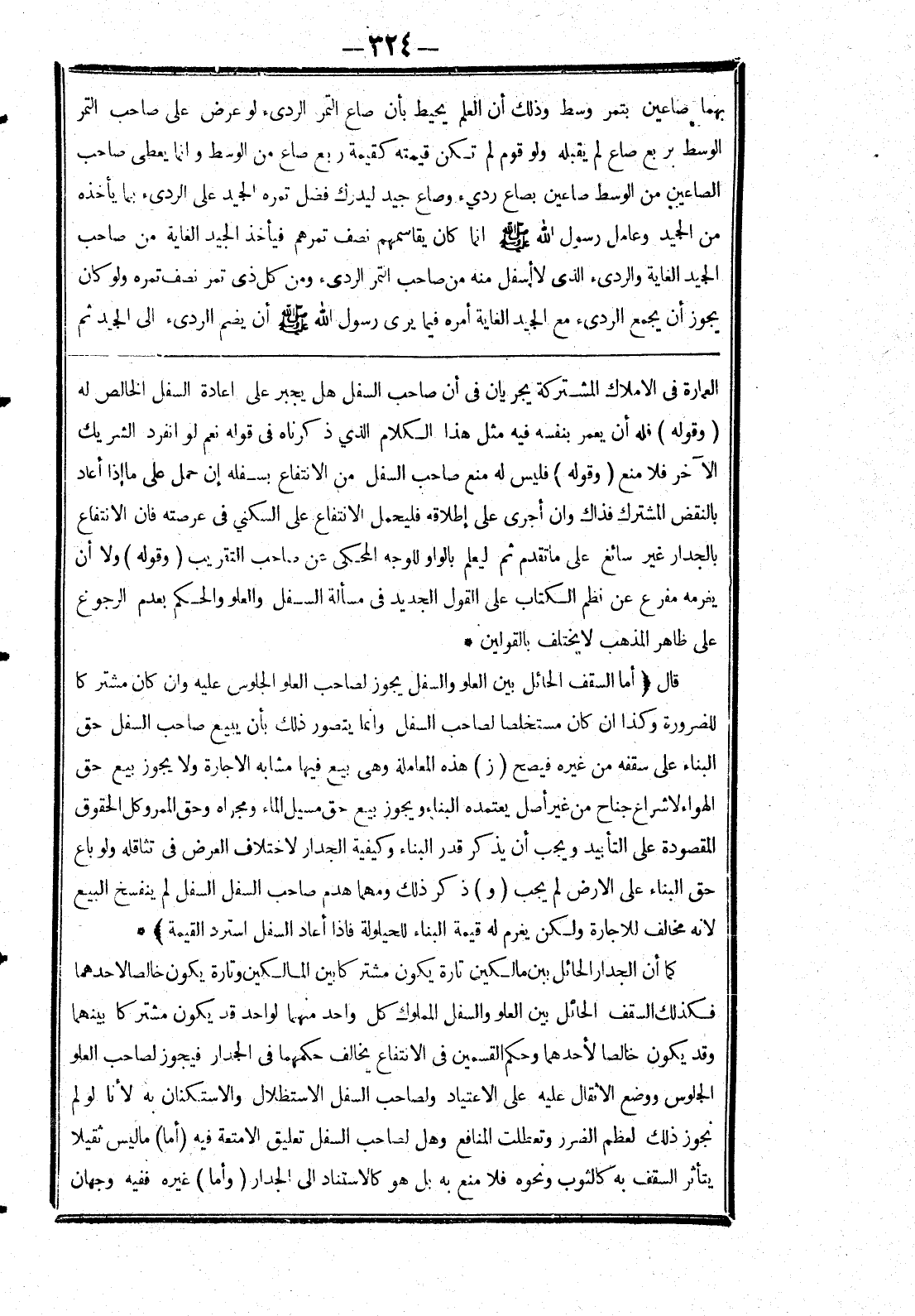 العمارة في الاملاك المشتركة يجريان في أن صاحب السفل هل يجبر على اعادة السفل الخالص له (وقوله) فله أن يعمر بنفسه فيه مثل هذا الكلام الذي ذكرناه في قوله نعم لو انفرد الشريك الآخر فلا منع (وقوله) فليس له منع صاحب السفل من الانتفاع بسفله إن حمل على ما إذا أعاد بالنقض المشترك فذاك وان أجرى إطلاقه فليحمل الانتفاع على السكني في عرصته فان الانتفاع بالجدار غير سائغ على ما تقدم ثم ليعلم بالواو للوجه المحكى عن صاحب التقريب (وقوله) ولان أن يغرمه مفرع عن نظم الكتاب على القول الجديد في مسألة السفل والعلو والحكم بعدم الرجوع على ظاهر المذهب لا يختلف بالقولين * قال (أما السقف الحائل بين العلو والسفل يجوز لصاحب العلو الجلوس عليه وان كان مشتركا للضرورة وكذا ان كان مستخلصا لصاحب السفل وانما يتصور ذلك بأن يبيع صاحب السفل حق البناء على سقفه من غيره فيصح (ز) هذه المعاملة وهى بيع فيها مشابه الاجارة ولايجوز بيع حق الهواء لاشراع جناح من غير أصل يعتمده البناء ويجوز بيع حق مسيل الماء ومجراه وحق الممر وكل الحقوق المقصودة على التأبيد ويجب أن يذكر قدر البناء وكيفية الجدار لاختلاف العرض في تثاقله ولو باع حق البناء على الارض لم يجب (و) ذكر ذلك ومهما هدم صاحب السفل السفل لم ينفسخ البيع لانه مخالف للاجارة ولكن يغرم له قيمة البناء للحيلولة فإذا أعاد السفل استرد القيمة) * كما أن الجدار الحائل بين مالكين تارة يكون مشتركا بين المالكين وتارة يكون خالصا لاحدهما فكذلك السقف الحائل بين العلو والسفل المملوك كل واحد منهما لواحد قد يكون مشتركا بينهما وقد يكون خالصا لاحدهما وحكم القسمين في الانتفاع يخالف حكمهما في الجدار فيجوز لصاحب العلو الجلوس ووضع الاثقال عليه على الاعتياد ولصاحب السفل الاستظلال والاستكنان به لانا لو لم نجوز ذلك لعظم الضرر وتعطلت المنافع وهل لصاحب السفل تعليق الامتعة فيه (أما) ما ليس ثقيلا