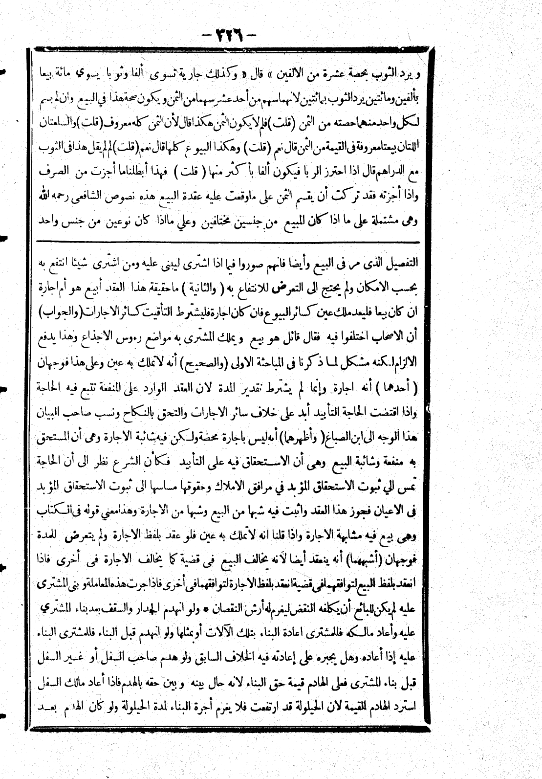التفصيل الذى مر في البيع وأيضا فانهم صوروا فيما إذا اشترى ليبنى عليه ومن اشترى شيئا انتفع به بحسب الامكان ولم يحتج إلى التعرض للانتفاع به (والثانية) ما حقيقة هذا العقد أبيع هو أم اجارة ان كان بيعا فليعد ملك عين كسائر البيوع فان كان اجارة فليشترط التأقيت كسائر الاجارات (والجواب) أن الاصحاب اختلفوا فيه فقال قائل هو بيع ويملك المشترى به مواضع رؤس الاجذاع وهذا يدفع الالزام لكنه مشكل لما ذكرنا في المباحثة الاولى (والصحيح) أنه لا تملك به عين وعلى هذا فوجهان (أحدهما) أنه اجارة وإنما لم يشترط تقدير المدة لان العقد الوارد على المنفعة تتبع فيه الحاجة وإذا اقتضت الحاجة التأبيد أبد على خلاف سائر الاجارات والتحق بالنكاح ونسب صاحب البيان هذا الوجه إلى ابن الصباغ (وأظهرهما) أنه ليس باجارة محضة ولكن فيه شائبة الاجارة وهى أن المستحق به منفعة وشائبة البيع وهى أن الاستحقاق فيه على التأبيد فكأن الشرع نظر إلى أن الحاجة تمس إلى ثبوت الاستحقاق المؤبد في مرافق الاملاك وحقوقها مساسها إلى ثبوت الاستحقاق المؤبد في الاعيان فجوز هذا العقد واثبت فيه شبها من البيع وشبها من الاجارة وهذا معنى قوله في الكتاب وهى بيع فيه مشابهة الاجارة وإذا قلنا انه لا تملك به عين فلو عقد بلفظ الاجارة ولم يتعرض للمدة فوجهان (أشبههما) أنه ينعقد أيضا لانه يخالف في قضية كما يخالف الاجارة في أخرى فإذا عقد بلفظ الاجارة في أخرى فإذا انعقد بلفظ البيع لتوافقهما في قضية انعقد بلفظ الاجارة لتوافقهما في أخرى فإذا جرت هذه المعاملة وبنى المشترى عليه لم يكن للبائع أن يكلفه النقض ليغرم له أرش النقصان * ولو انهدم الجدار والسقف بعد بناء المشترى عليه وأعاد مالكه فللمشترى اعادة البناء بتلك الآلات أو بمثلها ولو انهدم قبل البناء فللمشترى البناء عليه إذا أعاده وهل يجبره على إعادته فيه الخلاف السابق ولو هدم صاحب السفل أو غير السفل قبل بناء المشترى فعلى الهادم قيمة حق البناء لانه حال بينه وبين حقه بالهدم فإذا أعاد مالك السفل استرد الهادم القيمة لان الحيلولة قد ارتفعت فلا يغرم أجرة البناء لمدة الحيلولة ولو كان الهدم بعد
