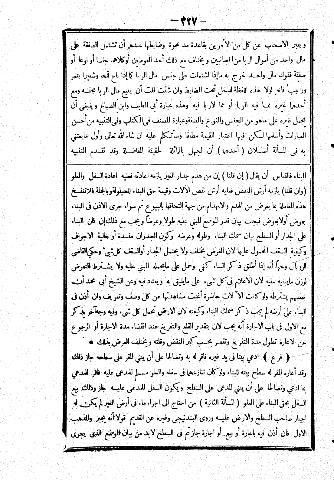 (وان قلنا) يلزمه أرش النقص فعليه أرش نقص الالات وقيمة حق البناء للحيلولة بالجملة فلا تنفسخ هذه المعاملة بما يعرض من الهدم والانهدام من جهة التحاقها بالبيوع ثم سواء جرى الاذن في البناء بعوض أو لا بعوض فيجب بيان قدر الموضع المبنى على طولا وعرضا ويجب مع ذلك إن كان البناء لى الجدار أو والسطح بيان سمك البناء وطوله وعرضه وكون الجدران منسدة أو خالية الا جواف وكيفية السقف المحمول عليها لان الغرض يختلف ولا يحتمل الجدار أو السقف كل شئ وحكى القاضى الرويانى وجها أنه إذا أطلق ذكر البناء كفى وحمل على ما يحمله المبنى على ولا يشترط التعرض لوزن ما يبنيه على لان الاعلام في كل شئ على ما يليق به ويعتاد فيه وعن الشيخ أبى محمد أن بعضهم يشترطه ولو كانت الآلات حاضرة أغنت مشاهدتها عن كل وصف وتعريف وان أذن في البناء على أرضه لم يجب ذكر سمك البناء وكيفته لان الارض تحمل كل شئ وفيه وجه آخر يذكر مع الاول في باب الاجارة أنه يجب لان بتقدير القلع والتفريغ عند انقضاء مدة الاجارة أو الرجوع عن الاعارة تطول مدة التفريغ وتقصر بحسب كبر النقض وقلته ويختلف الغرض بذلك * (فرع) ادعى بيتا في يد غيره فاقر له به وتصالحا على أن يبنى المقر على سطحه جاز ذلك وقد أعاره المقر له سطح بيته للبناء ولو كان تنازعهما في سفله والعلو مسلم للمدعى عليه فاقر للمدعى بما ادعى وتصالحا على أن يبنى المدعى على السطح ويكون السفل للمدعى عليه جاز وذلك بيع السفل بحق البناء على العلو (المسألة الثانية) من احتاج إلى اجراء ماء في أرض الغير لم يكن له اجبار صاحب السطح والارض عليه وروى البندنيجى وغيره عن القديم قولا أنه يجبر والمذهب الاول فان أذن فيه باعارة أو بيع أو اجارة جاز ثم في السطح لابد من بيان الموضع الذي يجرى