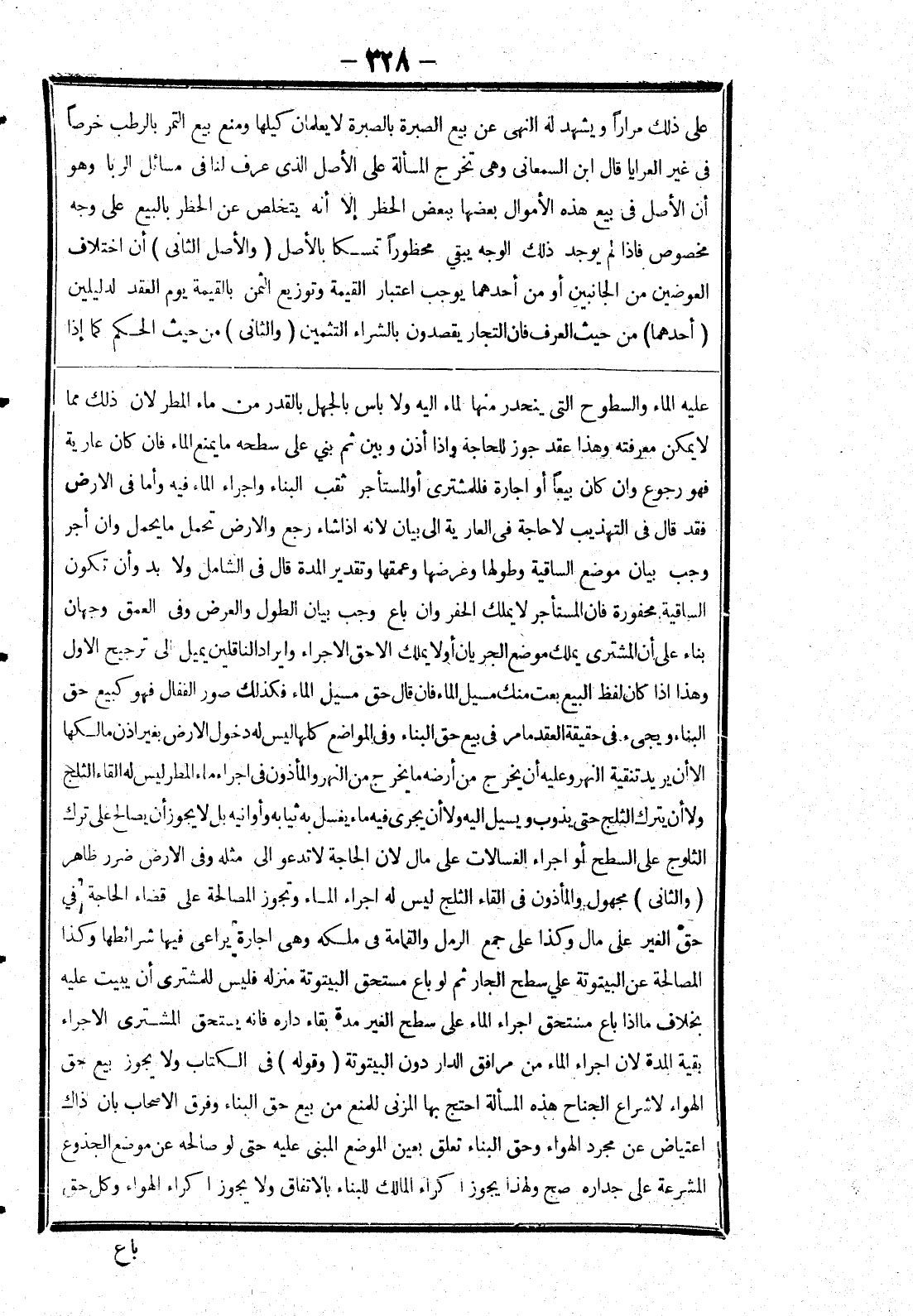 عليه الماء والسطوح التى ينحدر منها لماء إليه ولا باس بالجهل بالقدر من ماء المطر لان ذلك مما لا يمكن معرفته وهذا عقد جوز للحاجة وإذا أذن وبين ثم بنى على سطحه ما يمنع الماء فان كان عارية فهو رجوع وان كان بيعا أو اجارة فللمشترى أو المستأجر ثقب البناء واجراء الماء فيه وأما في الارض فقد قال في التهذيب لا حاجة في العارية إلى بيان لانه إذا شاء رجع والارض تحمل ما يحمل وان أجر