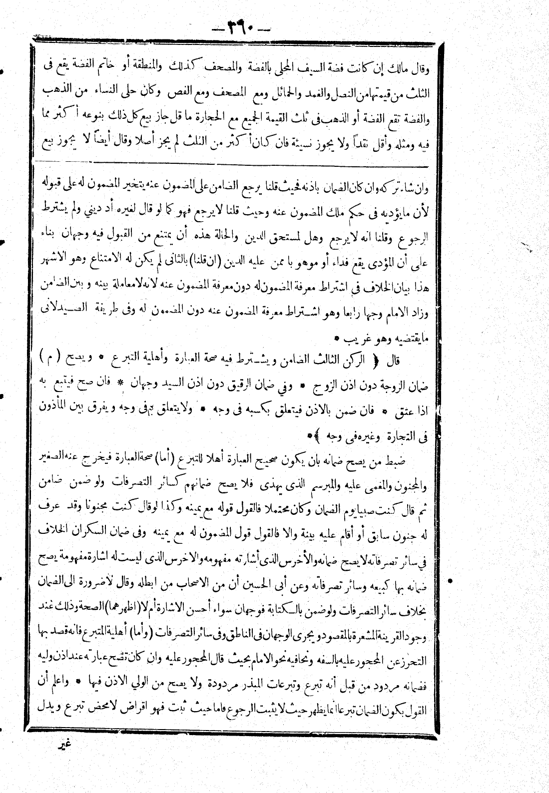 في سائر تصرفاته لا يصح ضمانه والاخراس الذى أشارته مفهومه والاخراس الذى ليست له اشارة مفهومة يصح ضمانه بها كبيعه وسائر تصرفاته وعن أبى الحسين أن من الاصحاب من ابطله وقال لا ضرورة إلى الضمان بخلاف سائر التصرفات ولو ضمن بالكتابة فوجهان سواء أحسن الاشارة أم لا (اظهرهما) الصحة وذلك عند وجود القرينة المشعرة بالمقصود ويجرى الوجهان في الناطق وفى سائر التصرفات (وأما) أهلية التبرع فانه قصد بها التحرز عن المحجور عليه بالسفه ونحافيه نحو الامام بحيث قال المحجور عليه وان كان تصح عبارته عند اذن وليه فضمانه مردود من قبل أنه تبرع وتبرعات المبذر مردودة ولا يصح من الولي الاذن فيها * واعلم أن القول بكون الضمان تبرعا انما يظهر حيث لا يثبت الرجوع فاما حيث ثبت فهو اقراض لا محض تبرع ويدل