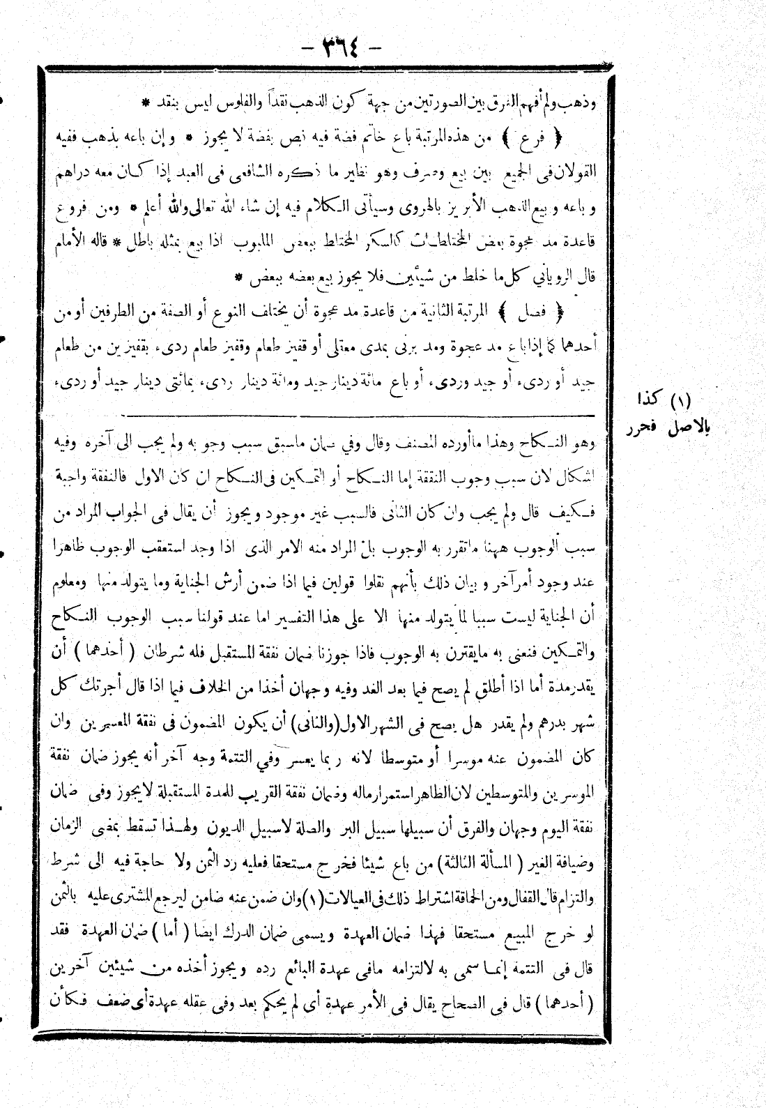 وهو النكاح وهذا ما أورده المصنف وقال وفى ضمان ما سبق سبب وجوبه ولم يجب إلى آخره وفيه اشكال لان سبب وجوب النفقة إما النكاح أو التمكين في النكاح ان كان الاول فالنفقة واجبة فكيف قال ولم يجب وان كان الثاني فالسبب غير موجود ويجوز أن يقال في الجواب المراد من سبب الوجوب ههنا ما تقرر به الوجوب بل المراد منه الامر الذى إذا وجد استعقب الوجوب ظاهرا عند وجود أمر آخر وبيان ذلك بأنهم نقلوا قولين فيما إذا ضمن أرش الجناية وما يتولد منها ومعلوم أن الجناية ليست سببا لما يتولد منها الا على هذا التفسير اما عند قولنا سبب الوجوب النكاح والتمكين فنعنى به ما يقترن به الوجوب فإذا جوزنا ضمان نفقة المستقبل فله شرطان (أحدهما) أن يقدر مدة أما إذا أطلق لم يصح فيما بعد الغد وفيه وجهان أخذا من الخلاف فيما إذا قال أجرتك كل شهر بدرهم ولم يقدر هل يصح في الشهر الاول (والثانى) أن يكون المضمون في نفقة المعسرين وان كان المضمون عنه موسرا أو متوسطا لانه ربما يعسر وفي التتمة وجه آخر أنه يجوز ضمان نفقة الموسرين والمتوسطين لان الظاهر استمرار ماله وضمان نفقة القريب للمدة المستقبلة لا يجوز وفى ضمان نفقة اليوم وجهان والفرق أن سبيلها سبيل البر والصلة لاسبيل الديون ولهذا تسقط بمضي الزمان وضيافة الغير (المسألة الثالثة) من باع شيئا فخرج مستحقا فعليه رد الثمن ولا حاجة فيه إلى شرط والتزام قال القفال ومن الحماقة اشتراط ذلك في العيالات وان ضمن عنه ضمن ليرجع المشترى عليه بالثمن لو خرج المبيع مستحقا فهذا ضمان العهدة ويسمى ضمان الدرك ايضا (أما) ضمان العهدة فقد قال في التتمة إنما سمى به لالتزمه ما في عهدة البائع رده ويجوز أخذه من شيئين آخرين (أحدهما) قال في الصحاح يقال في الامر عهدة أي لم يحكم بعد وفى عقله عهدة أي ضعف فكأن