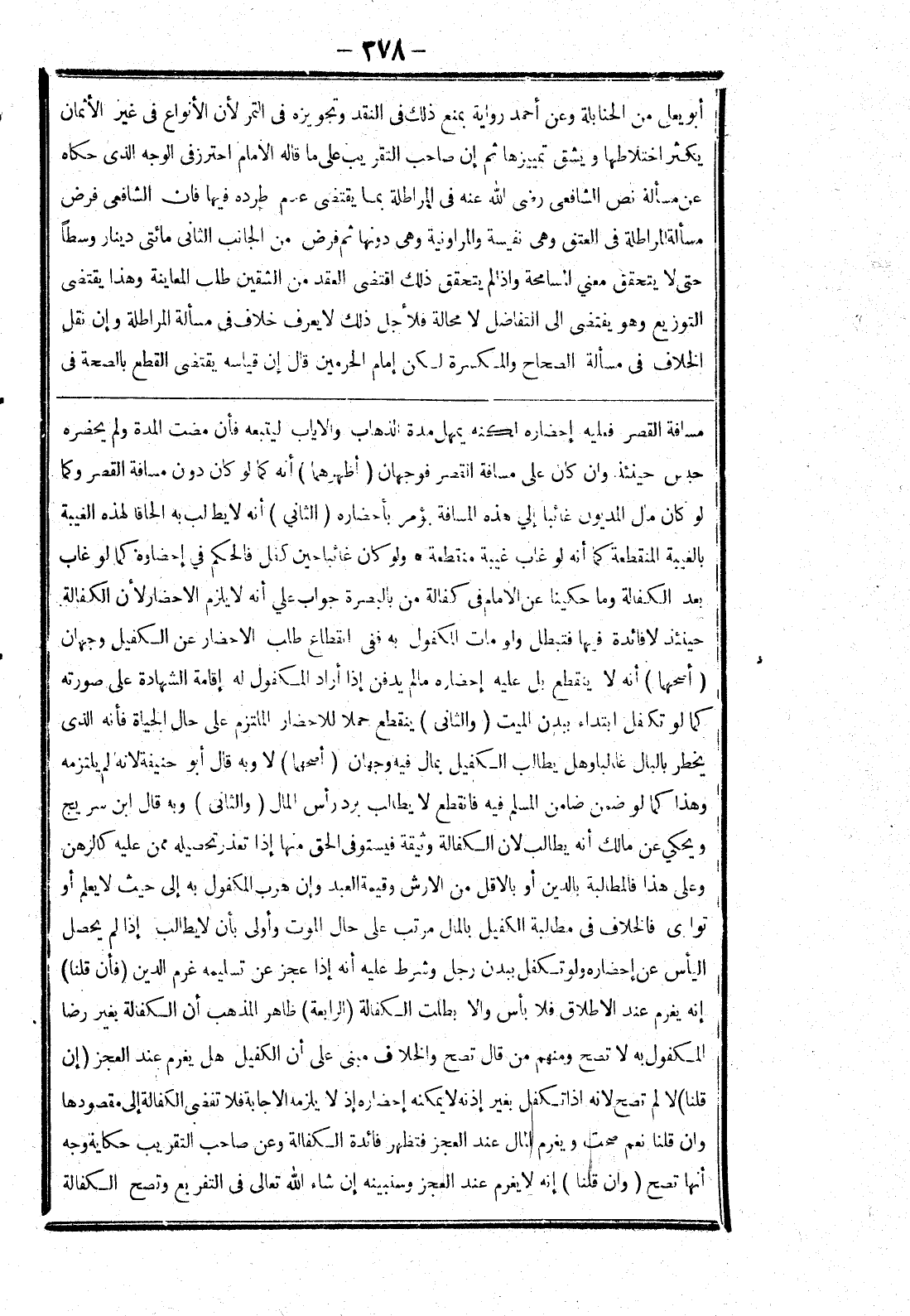 مسافة القصر فعليه إحضاره لكنه يمهل مدة الذهاب والاياب ليتبعه فأن مضت المدة ولم يحضره حبس حينئذ وان كان على مسافة القصر فوجهان (أظهرهما) أنه كما لو كان دون مسافة القصر وكما لو كان مال المديون غائبا إلي هذه المسافة يؤمر بأحضاره (الثاني) أنه لا يطلب به الحاقا لهذه الغيبة بالغيبة المنقطعة كما أنه لو غاب غيبة منقطعة * ولو كان غائبا حين كفل فالحكم في إحضاره كما لو غاب بعد الكفالة وما حكينا عن الامام في كفالة من بالبصرة جواب علي أنه لا يلزم الاحضار لان الكفالة حينئذ لا فائدة فيها فتبطل ولو مات المكفول به ففى انقطاع طلب الاحضار عن الكفيل وجهان (أصحهما) انه لا ينقطع بل عليه إحضاره ما لم يدفن إذا أراد المكفول له إقامة الشهادة على صورته كما لو تكفل ابتداء ببدن الميت (والثانى) ينقطع حملا للاحضار الملتزم على حال الحياة فأنه الذى يخطر بالبال غالبا وهل يطلب الكفيل بمال فيه وجهان (أصحهما) لا وبه قال أبو حنيفة لانه لم يلتزمه وهذا كما لو ضمن ضامن المسلم فيه فانقطع لا يطالب برد رأس المال (والثانى) وبه قال ابن سريج ويحكي عن مالك أنه يطالب لان الكفالة وثيقة فيستوفى الحق منها إذا تعذر تحصيله ممن عليه كالرهن وعلى هذا فالمطالبة بالدين أو بالاقل من الارش وقيمة العبد وإن هرب المكفول به إلى حيث لا يعلم أو