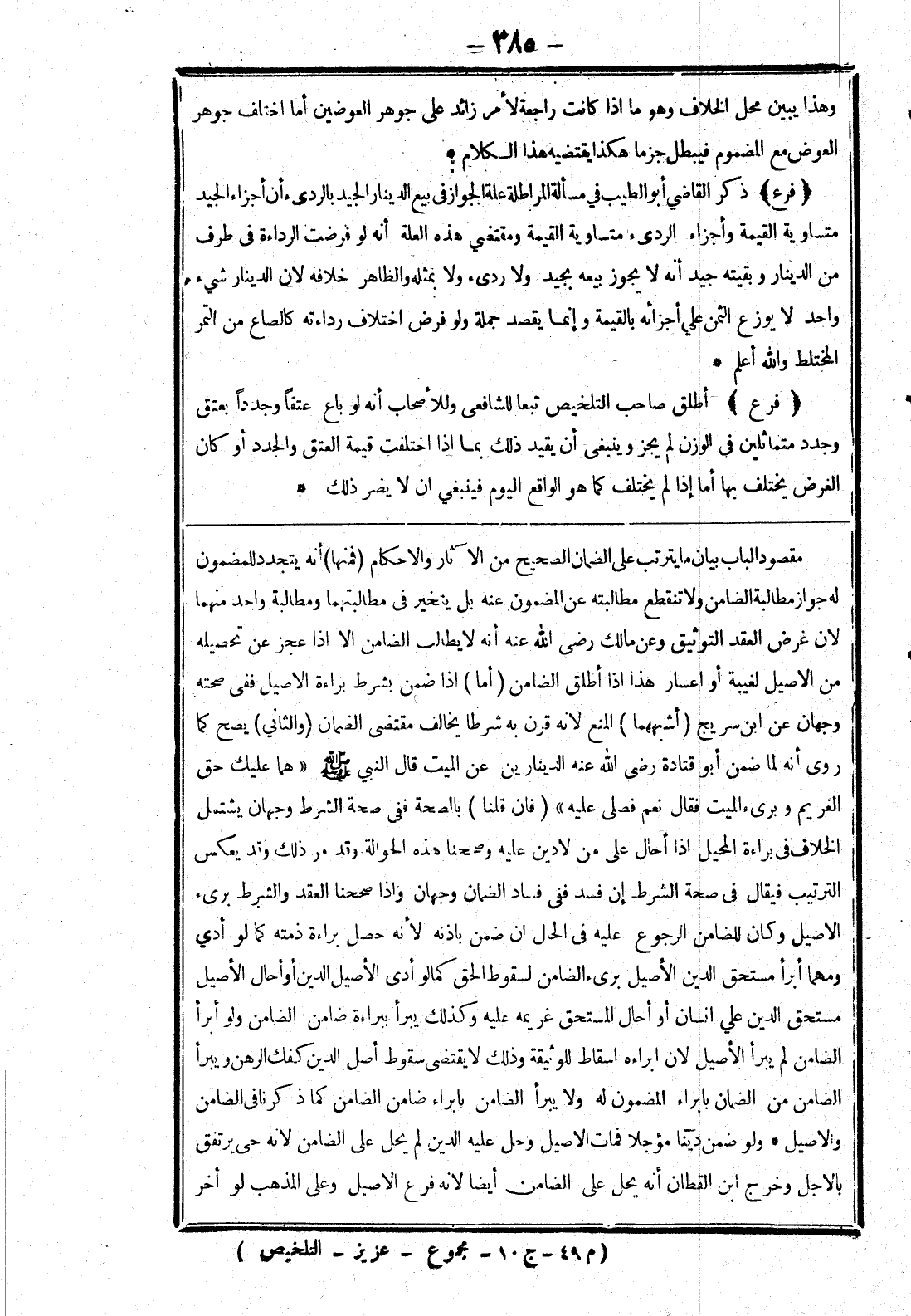 مقصود الباب بيان ما يترتب على الضمان الصحيح من الآثار والاحكام (فمنها) أنه يتجدد للمضمون له جواز مطالبة الضامن ولا تنقطع مطالبته عن المضمون عنه بل يختر في مطالبتهما ومطالبة واحد منهما لان غرض العقد التوثيق وعن مالك رضى الله عنه أنه لا يطالب الضامن الا إذا عجز عن تحصيله من الاصيل لغيبة أو اعسار هذا إذا أطلق الضامن (أما) إذا ضمن بشرط براءة الاصيل ففى صحته وجهان عن ابن سريج (أشبههما) المنع لانه قرن به شرطا يخالف مقتضى الضامن (والثاني) يصح كما روى أنه لما ضمن أبو قتادة رضى الله عنه الدينارين عن الميت قال النبي صلى الله عليه وسلم (هما عليك حق الغريم وبرئ الميت فقال نعم فصلى عليه) (فان قلنا) بالصحة ففى صحة الشرط وجهان يشتمل