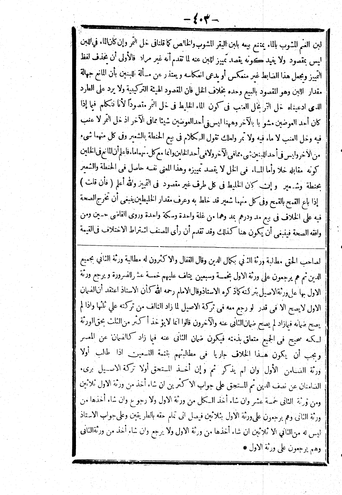 لصاحب الحق مطالبة ورثة الثاني بكمال الدين وقال القفال والاكثرون له مطالبة ورثة الثاني بجميع الدين ثم هم يرجعون على ورثة الاول بخمسة وسبعين يتلف عليهم خمسة عشر للضرورة ويرجع ورثة الاول بها على ورثة الاصيل بتركته كما ذكره الاستاذ وقال الامام رحمه الله كأن الاستاذ اعتقد أن الضمان الاول لا يصلح الا في قدر لو رجع معه في تركة الاصيل لما زاد التالف من تركته على ثلثها وإذا لم يصح ضمانه فيما زاد لم يصح ضمان الثاني عنه والآخرون قالوا انما لا يؤخذ أكثر من الثلث بحق الورثة لكنه صحيح في الجميع متعلق بذمته فيكون ضمان الثاني عنه فيما زاد كالضمان عن المعسر ويجب أن يكون هذا الخلاف جاريا في مطالبتهم بتتمة التسعين إذا طالب أولا ورثة الضامن الاول وان لم يذكر ثم وإن أخذ المستحق أولا تركة الاصيل برئ الضامنان عن نصف الدين ثم المستحق على جواب الاكثرين ان شاء أخذ من ورثة الاول ثلاثين ومن ورثة الثاني خمسة عشرون أخذ الكل من ورثة الاول ولا رجوع وان شاء أخذها من ورثة الثاني وهم يرجعون على ورثة الاول بثلاثين فيصل إلى تمام حقه بالطريقين وعلى جواب الاستاذ