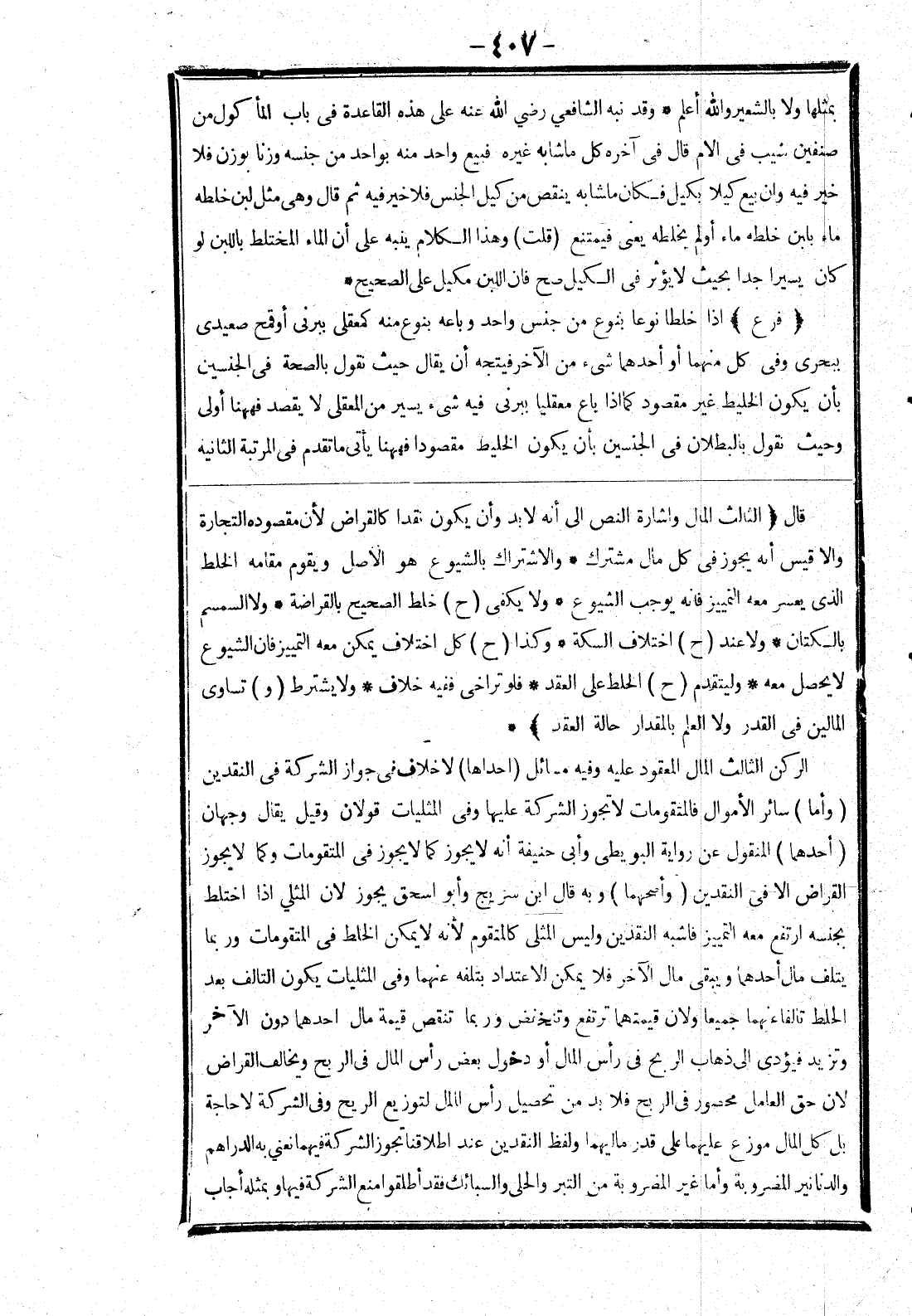 الخلط تالفا عنهما جميعا ولان قيمتهما ترتفع وتنخفض وربما تنقص قيمة مال احدهما دون الآخر وتزيد فيؤدى إلى ذهاب الربح في رأس المال أو دخول بعض رأس المال في الربح ويخالف القراض لان حق العامل محصور في الربح فلا بد من تحصيل رأس المال لتوزيع الريح وفى الشركة لا حاجة بل كل المال موزع عليهما على قدر ماليهما ولفظ النقدين عند اطلاقنا تجوز الشركة فيهما نعنى به الدراهم والدنانير المضروبة وأما غير المضروبة من التبر والحلى والسبائك فقد أطلقوا منع الشركة فيها وبمثله أجاب