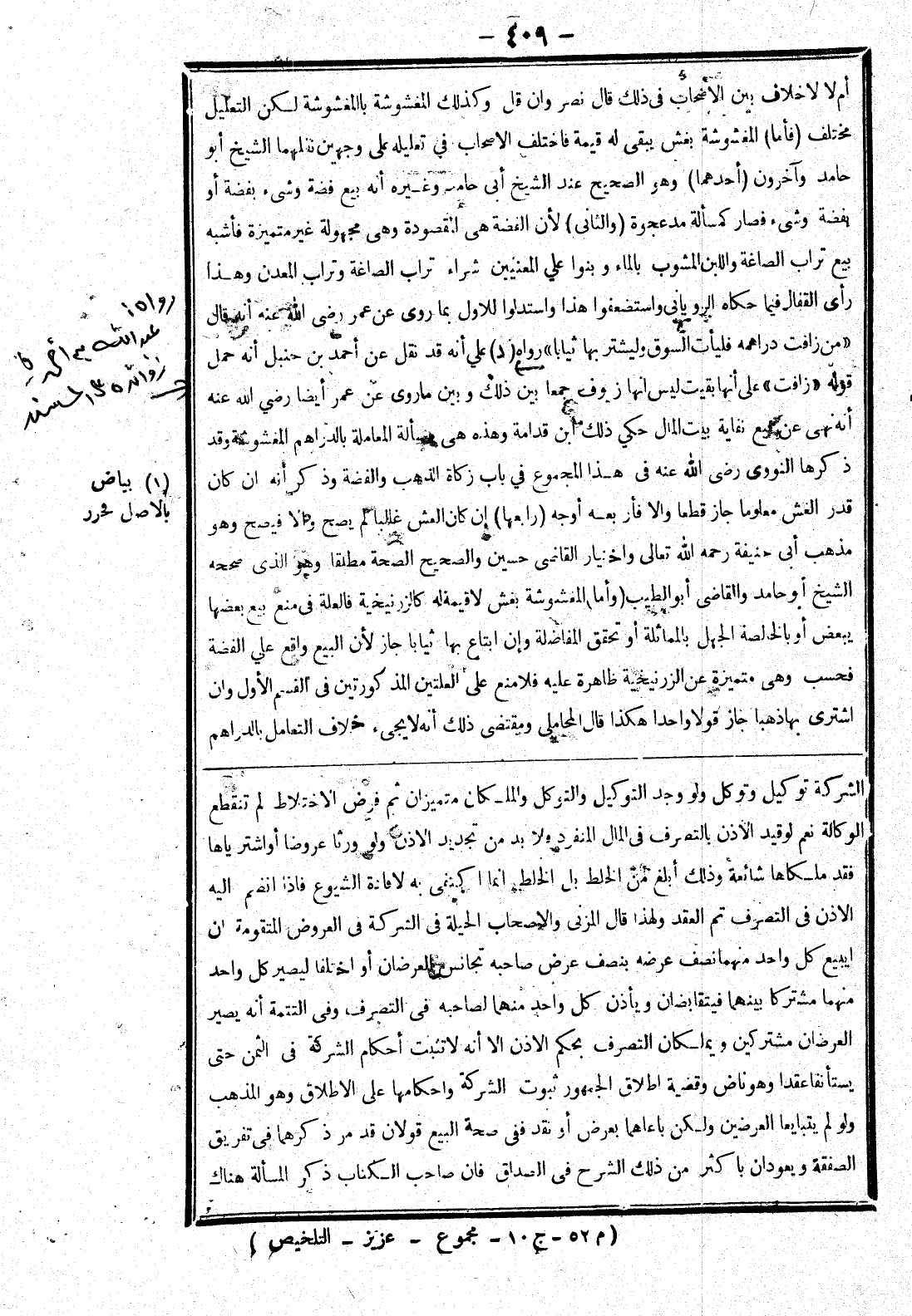 الشركة توكيل وتوكل ولو وجد التوكيل والتوكل والملكان متميزان ثم فرض الاختلاط لم تنقطع الوكالة نعم لو قيد الاذن بالتصرف في المال المنفرد فلا بد من تجديد الاذن ولو ورثا عروضا أو اشترياها فقد ملكاها شائعة وذلك أبلغ من الخلط بل الخلط انما اكتفى به لافادة الشيوع فإذا انضم إليه الاذن في التصرف تم العقد ولهذا قال المزني والاصحاب الحيلة في الشركة في العروض المتقومة ان ايبيع كل واحد منهما نصف عرضه بنصف عرض صاحبه تجانس العرضان أو اختلفا ليصير كل واحد منهما مشتركا بينهما فيتقابضان ويأذن كل واحد منهما لصاحبه في التصرف وفى التتمة أنه يصير العرضان مشتركين ويملكان التصرف بحكم الاذن الا أنه لا تثبت أحكام الشركة في الثمن حتى يستأنفا عقدا وهو ناض وقضية اطلاق الجمهور ثبوت الشركة واحكامها على الاطلاق وهو المذهب ولو لم يتبايعا العرضين ولكن باعاهما بعرض أو نقد ففى صحة البيع قولان قد مر ذكرهما في تفريق الصفقة ويعودان باكثر من ذلك الشرح في الصداق فان صاحب الكتاب ذكر المسألة هناك