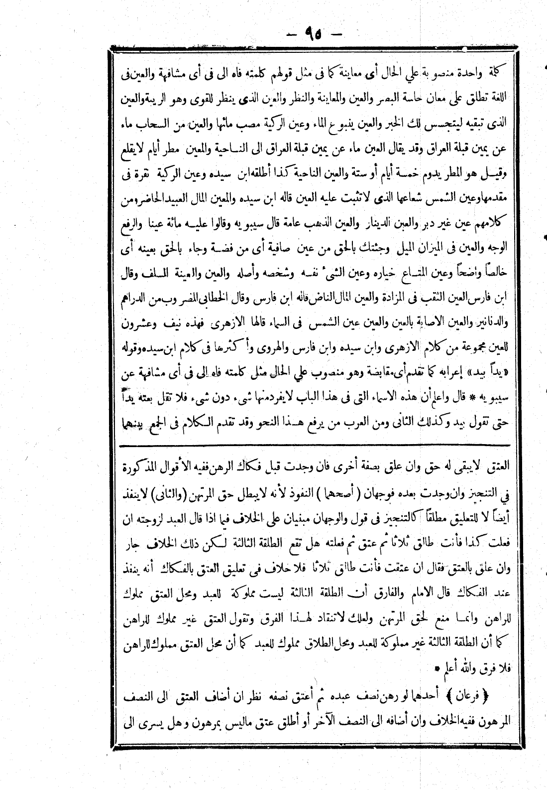 العتق لا يبقى له حق وان علق بصفة أخرى فان وجدت قبل فكاك الرهن ففيه الاقوال المذكورة في التنجيز وان وجدت بعده فوجهان (أصحهما) النفوذ لانه لا يبطل حق المرتهن (والثانى) لا ينفذ أيضا لا للتعليق مطلقا كالتنجيز في قول والوجهان شبتهان بالخلاف فيما إذا قال العبد لزوجته ان فعلت كذا فأنت طالق ثلاثا ثم عتق ثم فعلته هل تقع الطلقة الثالثة لكن ذلك الخلاف جار وان علق بالعتق فقال ان عتقت فأنت طالق ثلاثا فلا خلاف في تعليق العتق بالفكاك أنه ينفذ عند الفكاك قال الامام والفارق أن الطلقة الثالثة ليست مملوكة للعبد ومحل العتق مملوك للراهن وانما منع لحق المرتهن ولعلك لاتنقاد لهذا الفرق وتقول العتق غير مملوك للراهن كما أن الطلقة الثالثة غير مملوكة للعبد ومحل الطلاق مملوك للعبد كما أن محل العتق مملوك للراهن فلا فرق والله أعلم * (فرعان) أحدهما لو رهن نصف عبده ثم أعتق نصفه نظر ان أضاف العتق إلى النصف المرهون ففيه الخلاف وان أضافه إلى النصف الآخر أو أطلق عتق ما ليس بمرهون وهل يسرى إلى