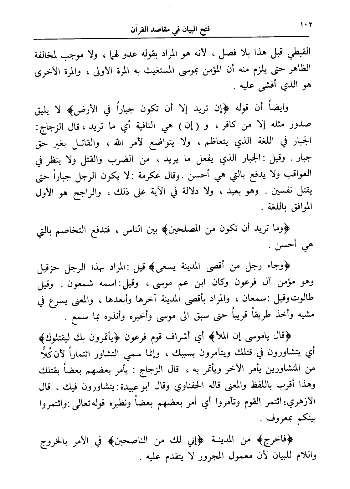 وأيضاً أن قوله (إن تريد إلا أن تكون جباراً في الأرض) لا يليق صدور مثله إلا من كافر، و (إن) هي النافية أي ما تريد، قال الزجاج: الجبار في اللغة الذي يتعاظم، ولا يتواضع لأمر الله، والقاتل بغير حق جبار. وقيل: الجبار الذي يفعل ما يريد، من الضرب والقتل ولا ينظر في العواقب ولا يدفع بالتي هي أحسن. وقال عكرمة: لا يكون الرجل جباراً حتى يقتل نفسين. وهو بعيد، ولا دلالة في الآية على ذلك، والراجح هو الأول الموافق باللغة.