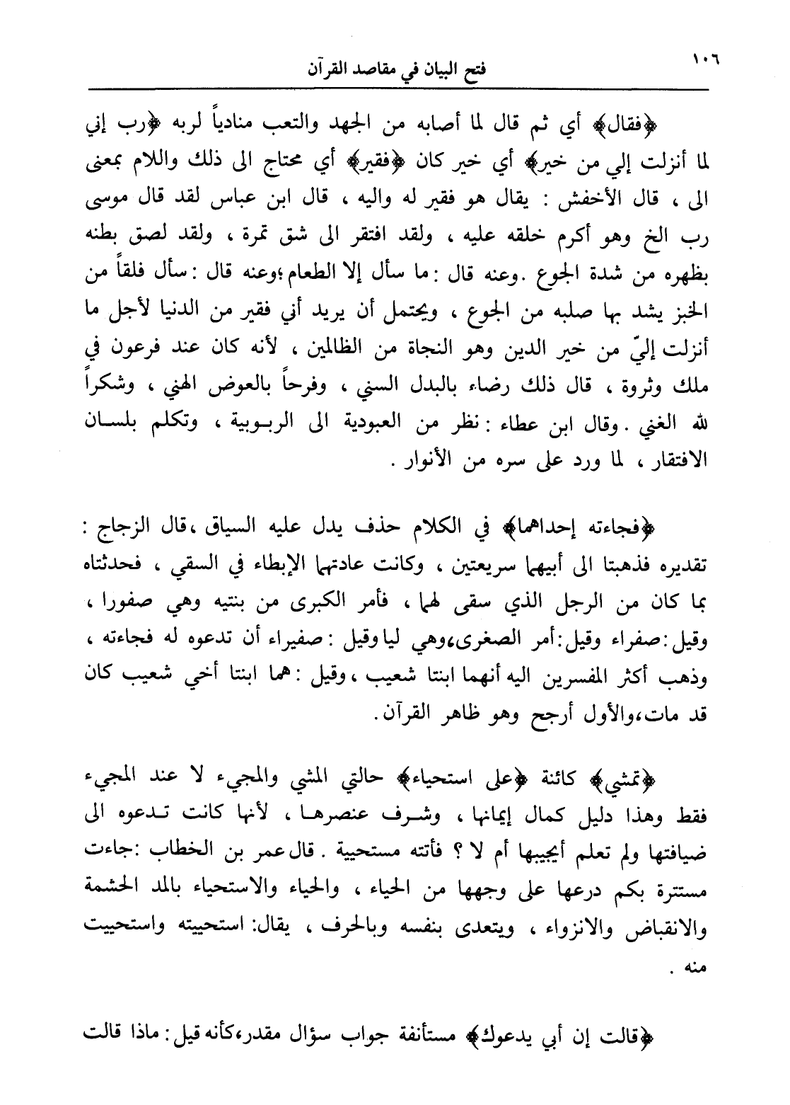 (فجاءته إحداهما) في الكلام حذف يدل عليه السياق، قال الزجاج: تقديره فذهبتا إلى أبيهما سريعتين، وكانت عادتهما الإبطاء في السقي، فحدثتاه بما كان من الرجل الذي سقى لهما، فأمر الكبرى من بنتيه وهي صفورا، وقيل: صفراء وقيل: أمر الصغرى، وهي ليا وقيل: صفيراء أن تدعوه له فجاءته، وذهب أكثر المفسرين إليه أنهما ابنتا شعيب، وقيل: هما ابنتا أخي شعيب كان قد مات، والأول أرجح وهو ظاهر القرآن.