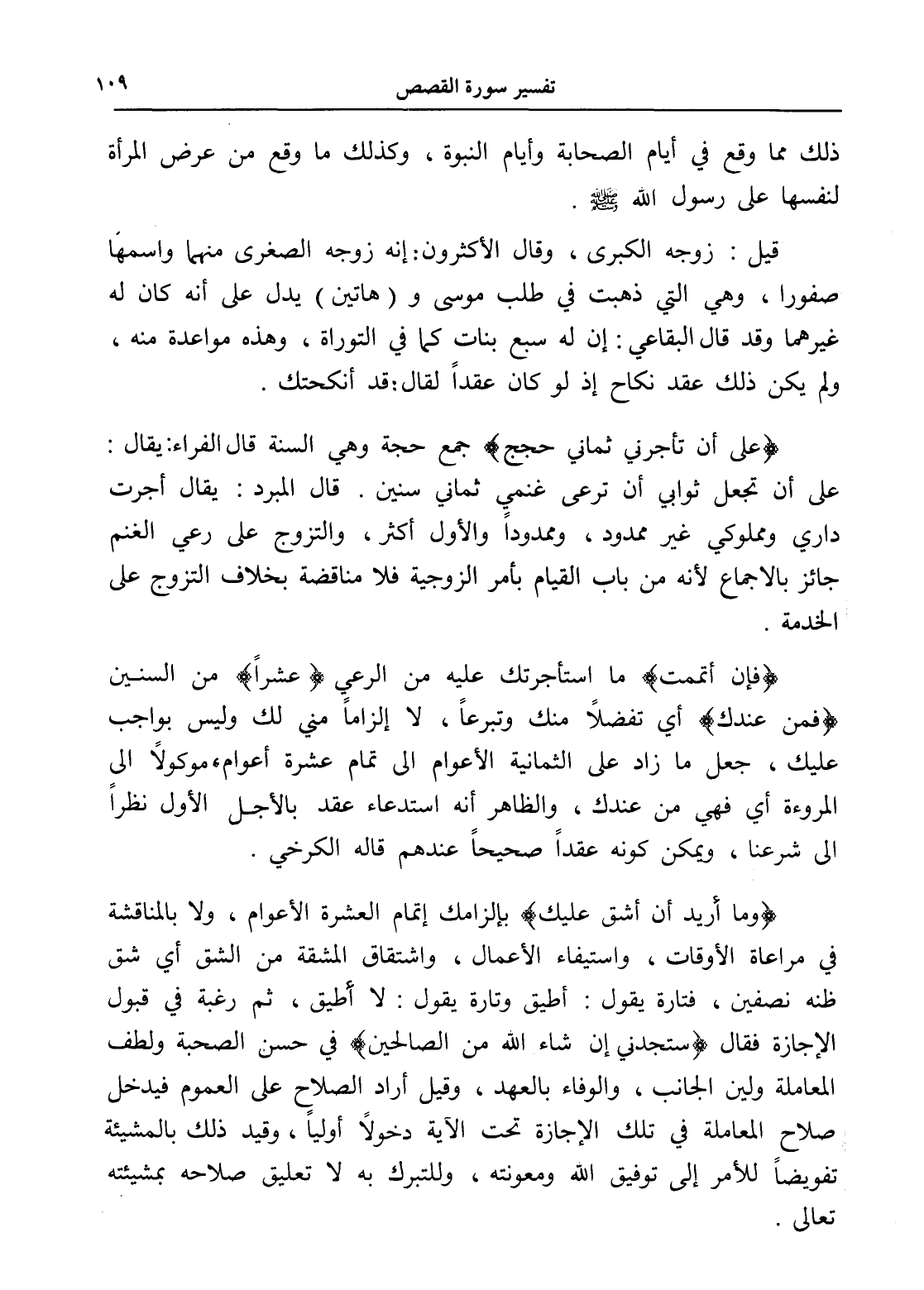 (على أن تأجرني ثماني حجج) جمع حجة وهي السنة قال الفراء: يقال: على أن تجعل ثوابي أن ترعى غنمي ثماني سنين. قال المبرد: يقال أجرت داري ومملوكي غير ممدود، وممدوداً والأول أكثر، والتزوج على رعي الغنم جائز بالإجماع لأنه من باب القيام بأمر الزوجية فلا مناقضة بخلاف التزوج على الخدمة.
