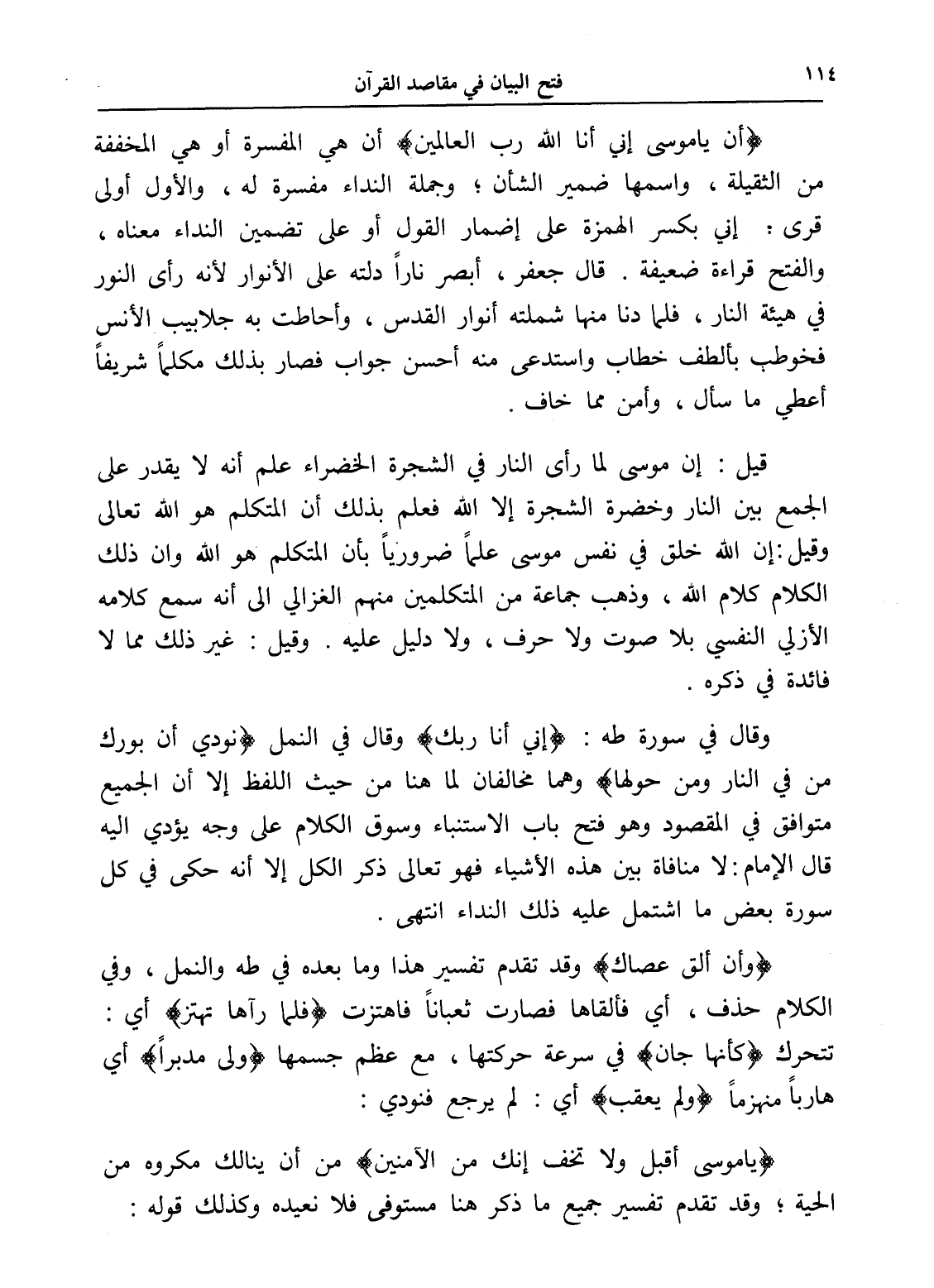 (أن يا موسى إني أنا الله رب العالمين) أن هي المفسرة أو هي المخففة من الثقيلة، واسمها ضمير الشأن؛ وجملة النداء مفسرة له، والأول أولى قرئ: إني بكسر الهمزة على إضمار القول أو على تضمين النداء معناه، والفتح قراءة ضعيفة. قال جعفر، أبصر ناراً دلته على الأنوار لأنه رأى النور في هيئة النار، فلما دنا منها شملته أنوار القدس، وأحاطت به جلابيب الأنس فخوطب بألطف خطاب واستدعى منه أحسن جواب فصار بذلك مكلماً شريفاً أعطي ما سأل، وأمن مما خاف.