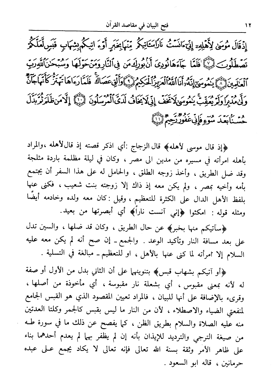 إِذْ قَالَ مُوسَى لِأَهْلِهِ إِنِّي آنَسْتُ نَارًا سَآتِيكُمْ مِنْهَا بِخَبَرٍ أَوْ آتِيكُمْ بِشِهَابٍ قَبَسٍ لَعَلَّكُمْ تَصْطَلُونَ (7) فَلَمَّا جَاءَهَا نُودِيَ أَنْ بُورِكَ مَنْ فِي النَّارِ وَمَنْ حَوْلَهَا وَسُبْحَانَ اللَّهِ رَبِّ الْعَالَمِينَ (8) يَا مُوسَى إِنَّهُ أَنَا اللَّهُ الْعَزِيزُ الْحَكِيمُ (9) وَأَلْقِ عَصَاكَ فَلَمَّا رَآهَا تَهْتَزُّ كَأَنَّهَا جَانٌّ وَلَّى مُدْبِرًا وَلَمْ يُعَقِّبْ يَا مُوسَى لَا تَخَفْ إِنِّي لَا يَخَافُ لَدَيَّ الْمُرْسَلُونَ (10) إِلَّا مَنْ ظَلَمَ ثُمَّ بَدَّلَ حُسْنًا بَعْدَ سُوءٍ فَإِنِّي غَفُورٌ رَحِيمٌ (11)