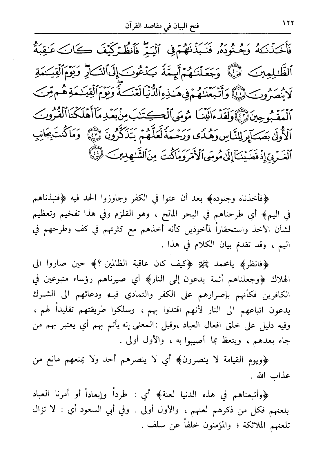 فَأَخَذْنَاهُ وَجُنُودَهُ فَنَبَذْنَاهُمْ فِي الْيَمِّ فَانْظُرْ كَيْفَ كَانَ عَاقِبَةُ الظَّالِمِينَ (40) وَجَعَلْنَاهُمْ أَئِمَّةً يَدْعُونَ إِلَى النَّارِ وَيَوْمَ الْقِيَامَةِ لَا يُنْصَرُونَ (41) وَأَتْبَعْنَاهُمْ فِي هَذِهِ الدُّنْيَا لَعْنَةً وَيَوْمَ الْقِيَامَةِ هُمْ مِنَ الْمَقْبُوحِينَ (42) وَلَقَدْ آتَيْنَا مُوسَى الْكِتَابَ مِنْ بَعْدِ مَا أَهْلَكْنَا الْقُرُونَ الْأُولَى بَصَائِرَ لِلنَّاسِ وَهُدًى وَرَحْمَةً لَعَلَّهُمْ يَتَذَكَّرُونَ (43) وَمَا كُنْتَ بِجَانِبِ الْغَرْبِيِّ إِذْ قَضَيْنَا إِلَى مُوسَى الْأَمْرَ وَمَا كُنْتَ مِنَ الشَّاهِدِينَ (44)
