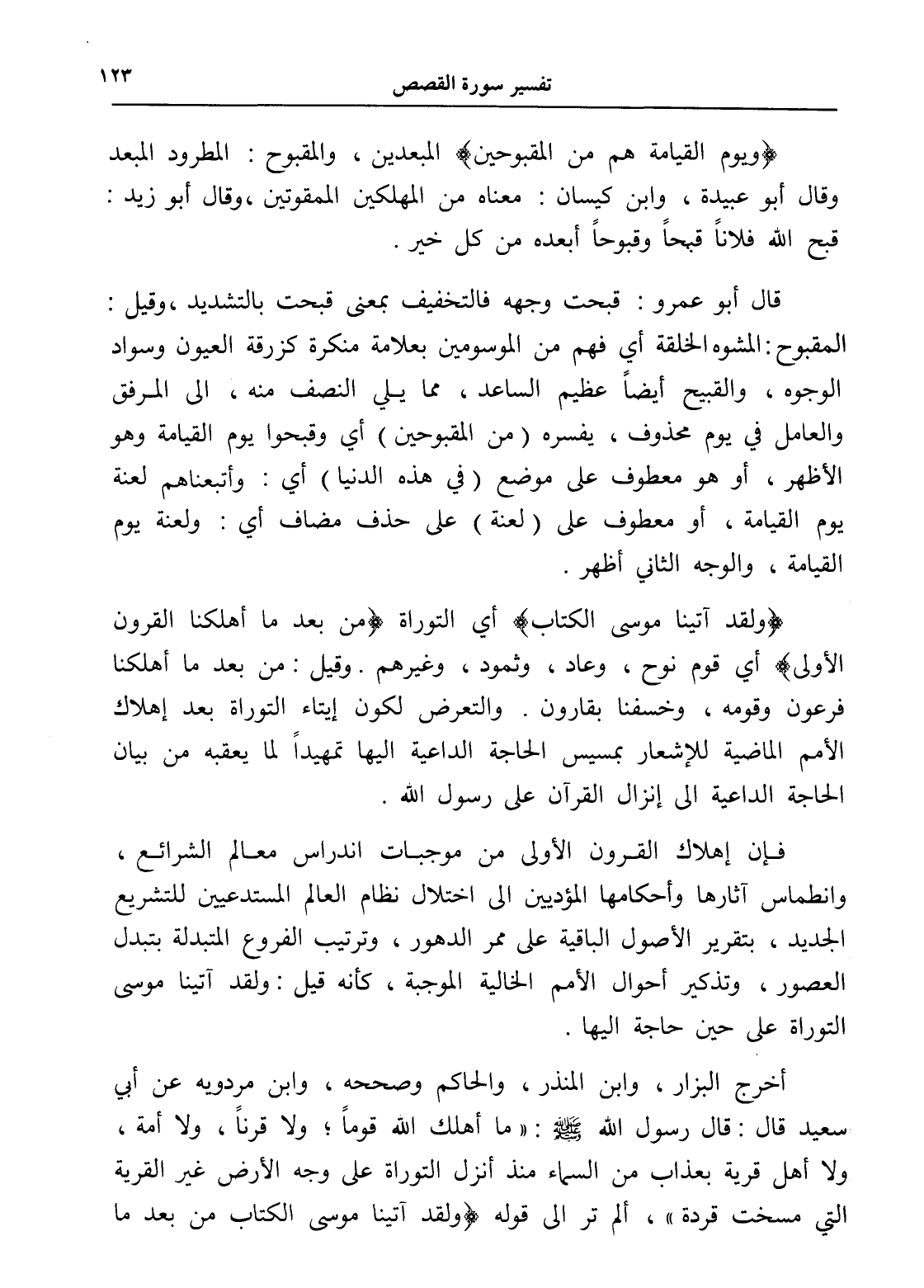 أخرج البزار، وابن المنذر، والحاكم وصححه، وابن مردويه عن أبي سعيد قال: قال رسول الله - صلى الله عليه وسلم -: " ما أهلك الله قوماً؛ ولا قرناً، ولا أمة، ولا أهل قرية بعذاب من السماء منذ أنزل التوراة على وجه الأرض غير القرية التي مسخت قردة "، ألم تر إلى قوله (ولقد آتينا موسى الكتاب من بعد ما