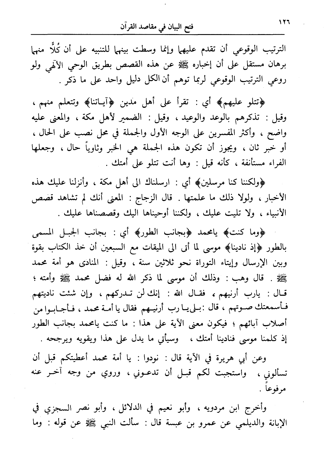 الترتيب الوقوعي أن تقدم عليهما وإنما وسطت بينهما للتنبيه على أن كُلاًّ منهما برهان مستقل على أن إخباره - صلى الله عليه وسلم - عن هذه القصص بطريق الوحي الألهي ولو روعي الترتيب الوقوعي لربما توهم أن الكل دليل واحد على ما ذكر.