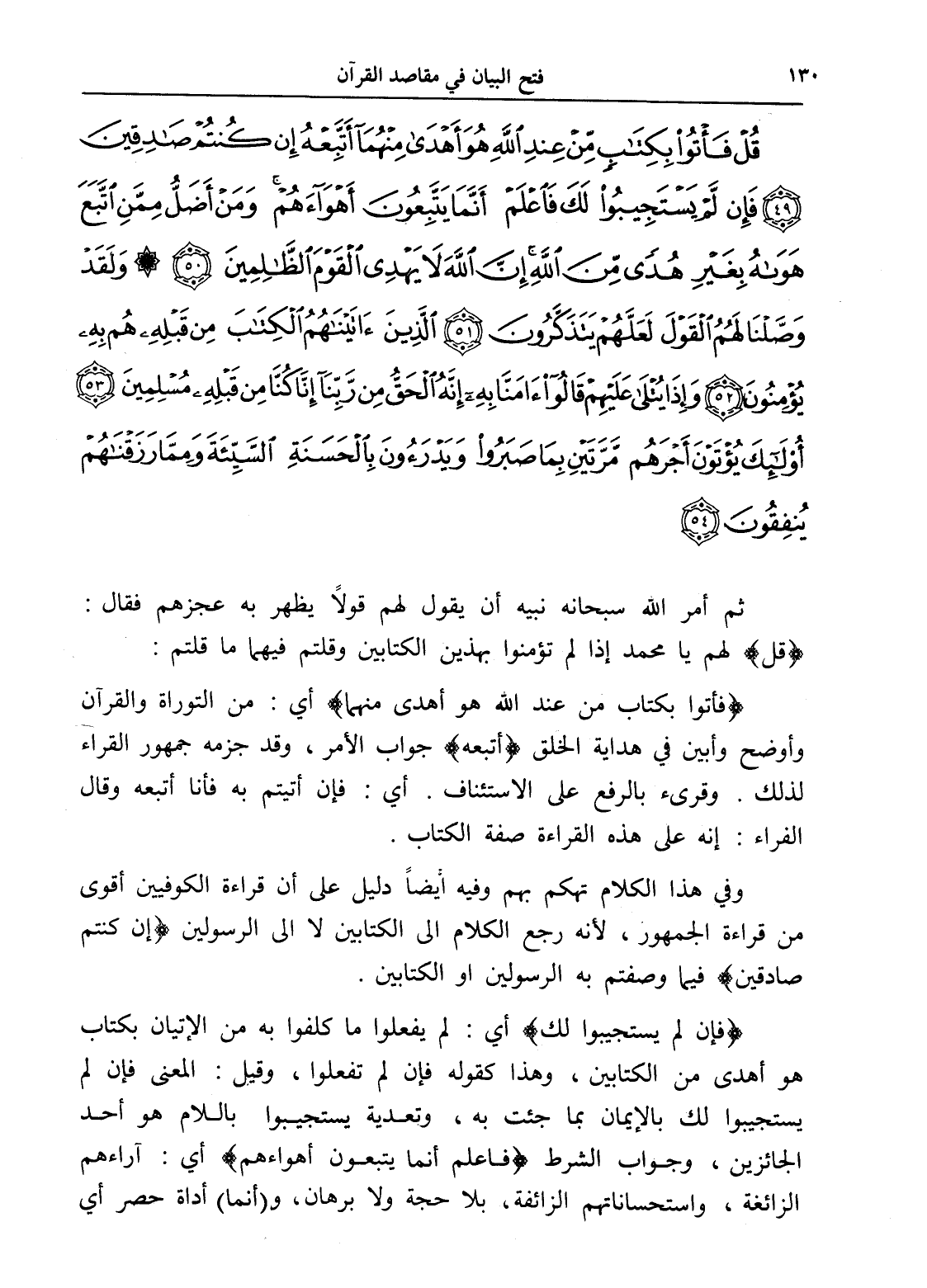 قُلْ فَأْتُوا بِكِتَابٍ مِنْ عِنْدِ اللَّهِ هُوَ أَهْدَى مِنْهُمَا أَتَّبِعْهُ إِنْ كُنْتُمْ صَادِقِينَ (49) فَإِنْ لَمْ يَسْتَجِيبُوا لَكَ فَاعْلَمْ أَنَّمَا يَتَّبِعُونَ أَهْوَاءَهُمْ وَمَنْ أَضَلُّ مِمَّنِ اتَّبَعَ هَوَاهُ بِغَيْرِ هُدًى مِنَ اللَّهِ إِنَّ اللَّهَ لَا يَهْدِي الْقَوْمَ الظَّالِمِينَ (50) وَلَقَدْ وَصَّلْنَا لَهُمُ الْقَوْلَ لَعَلَّهُمْ يَتَذَكَّرُونَ (51) الَّذِينَ آتَيْنَاهُمُ الْكِتَابَ مِنْ قَبْلِهِ هُمْ بِهِ يُؤْمِنُونَ (52) وَإِذَا يُتْلَى عَلَيْهِمْ قَالُوا آمَنَّا بِهِ إِنَّهُ الْحَقُّ مِنْ رَبِّنَا إِنَّا كُنَّا مِنْ قَبْلِهِ مُسْلِمِينَ (53) أُولَئِكَ يُؤْتَوْنَ أَجْرَهُمْ مَرَّتَيْنِ بِمَا صَبَرُوا وَيَدْرَءُونَ بِالْحَسَنَةِ السَّيِّئَةَ وَمِمَّا رَزَقْنَاهُمْ يُنْفِقُونَ (54)