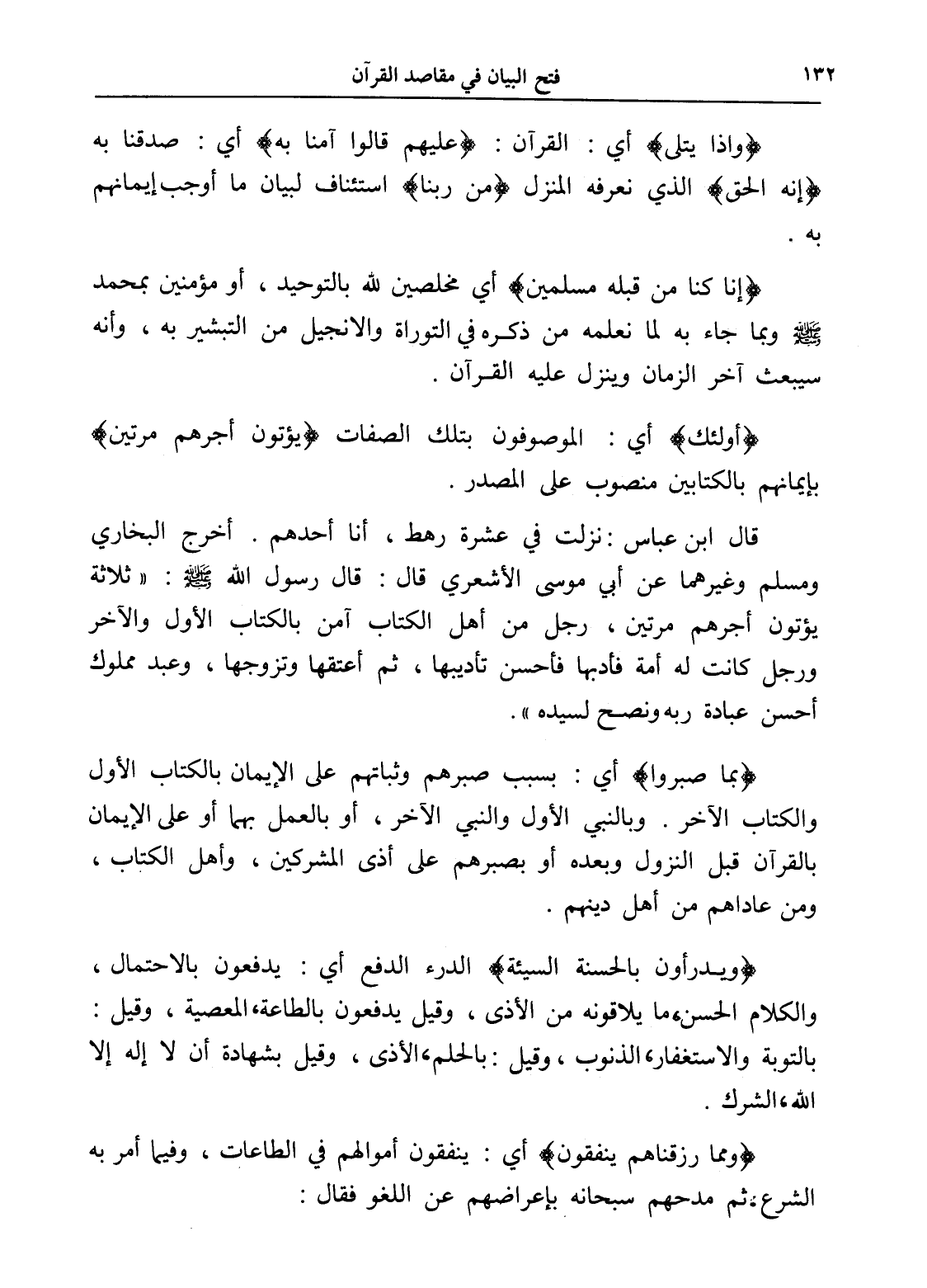 قال ابن عباس: نزلت في عشرة رهط، أنا أحدهم. أخرج البخاري ومسلم وغيرهما عن أبي موسى الأشعري قال: قال رسول الله - صلى الله عليه وسلم -: " ثلاثة يؤتون أجرهم مرتين، رجل من أهل الكتاب آمن بالكتاب الأول والآخر ورجل كانت له أمة فأدبها فأحسن تأديبها، ثم أعتقها وتزوجها، وعبد مملوك أحسن عبادة ربه ونصح لسيده ".