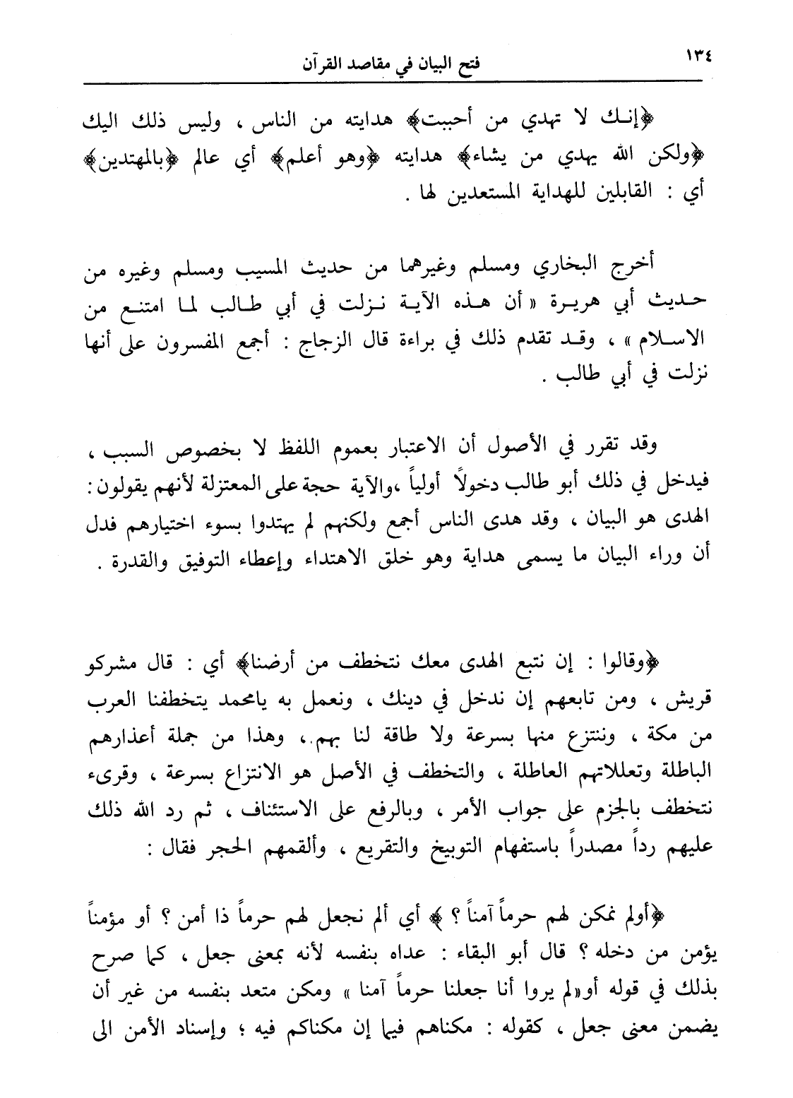 وقد تقرر في الأصول أن الاعتبار بعموم اللفظ لا بخصوص السبب، فيدخل في ذلك أبو طالب دخولاً أولياً، والآية حجة على المعتزلة لأنهم يقولون: الهدى هو البيان، وقد هدى الناس أجمع ولكنهم لم يهتدوا بسوء اختيارهم فدل أن وراء البيان ما يسمى هداية وهو خلق الاهتداء وإعطاء التوفيق والقدرة.