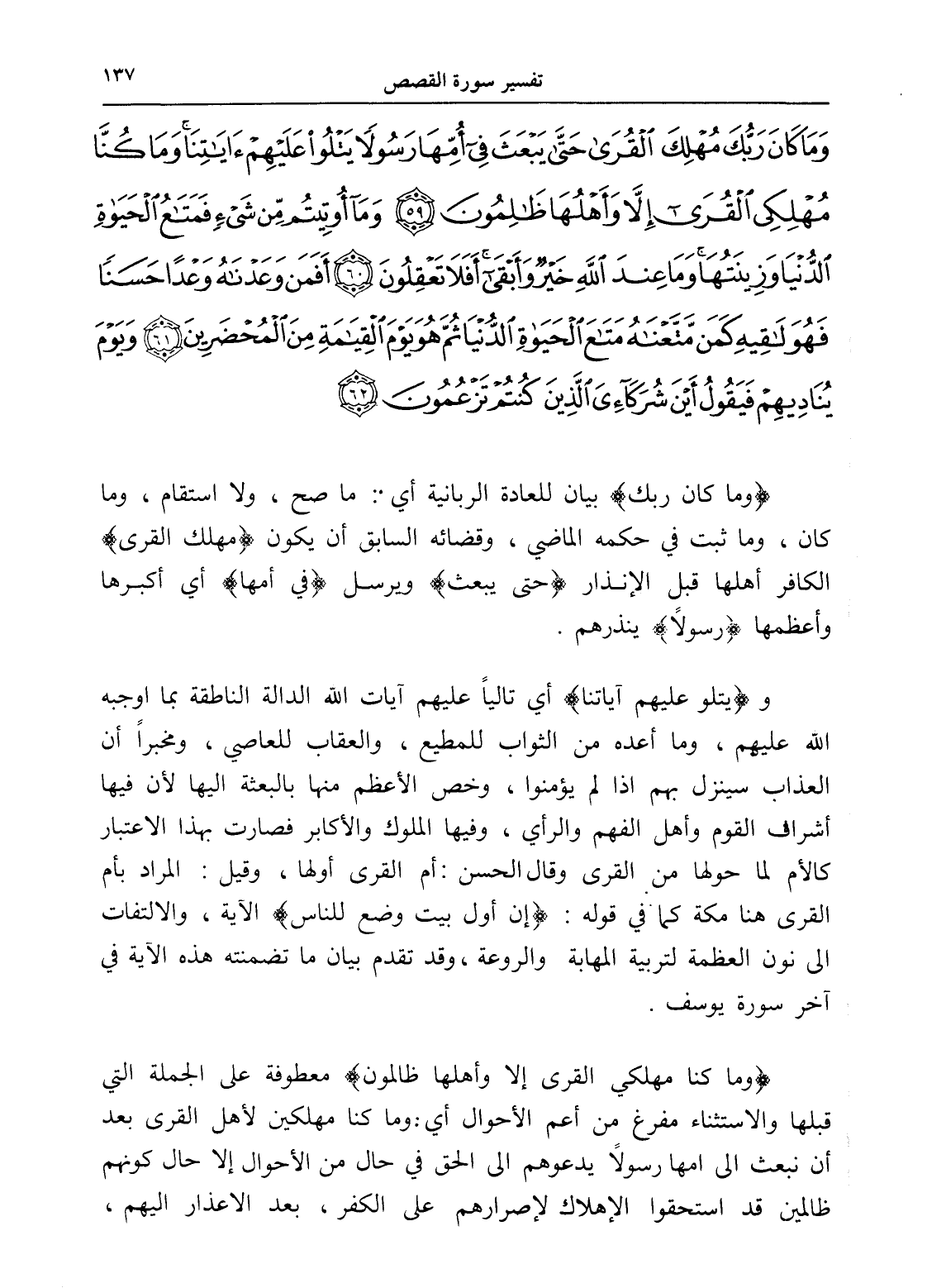 وَمَا كَانَ رَبُّكَ مُهْلِكَ الْقُرَى حَتَّى يَبْعَثَ فِي أُمِّهَا رَسُولًا يَتْلُو عَلَيْهِمْ آيَاتِنَا وَمَا كُنَّا مُهْلِكِي الْقُرَى إِلَّا وَأَهْلُهَا ظَالِمُونَ (59) وَمَا أُوتِيتُمْ مِنْ شَيْءٍ فَمَتَاعُ الْحَيَاةِ الدُّنْيَا وَزِينَتُهَا وَمَا عِنْدَ اللَّهِ خَيْرٌ وَأَبْقَى أَفَلَا تَعْقِلُونَ (60) أَفَمَنْ وَعَدْنَاهُ وَعْدًا حَسَنًا فَهُوَ لَاقِيهِ كَمَنْ مَتَّعْنَاهُ مَتَاعَ الْحَيَاةِ الدُّنْيَا ثُمَّ هُوَ يَوْمَ الْقِيَامَةِ مِنَ الْمُحْضَرِينَ (61) وَيَوْمَ يُنَادِيهِمْ فَيَقُولُ أَيْنَ شُرَكَائِيَ الَّذِينَ كُنْتُمْ تَزْعُمُونَ (62)
