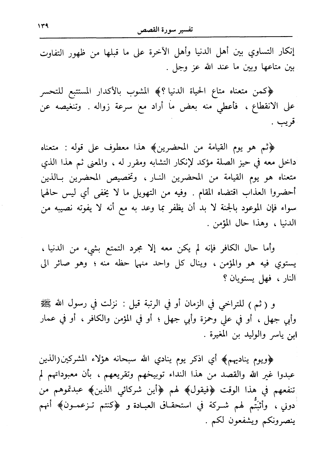 (ثم هو يوم القيامة من المحضرين) هذا معطوف على قوله: متعناه داخل معه في حيز الصلة مؤكد لإنكار التشابه ومقرر له، والمعنى ثم هذا الذي متعناه هو يوم القيامة من المحضرين النار، وتخصيص المحضرين بالذين أحضروا العذاب اقتضاه المقام. وفيه من التهويل ما لا يخفى أي ليس حالهما سواء فإن الموعود بالجنة لا بد أن يظفر بما وعد به مع أنه لا يفوته نصيبه من الدنيا، وهذا حال المؤمن.