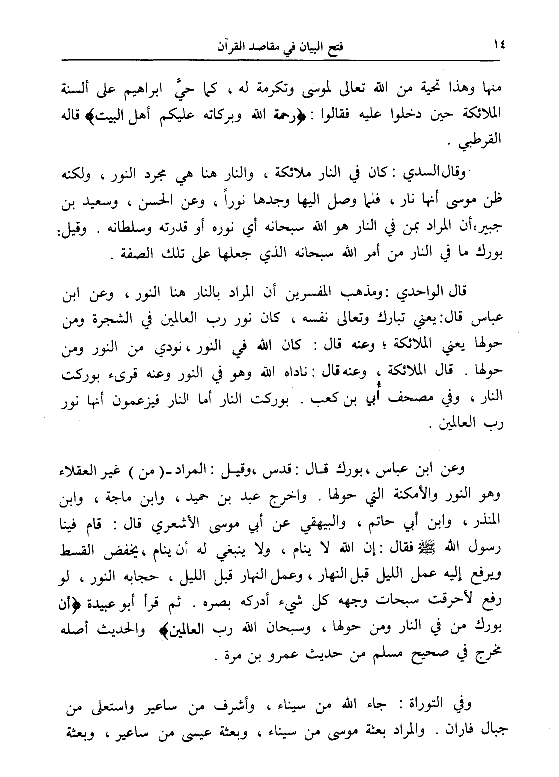 قال الواحدي: ومذهب المفسرين أن المراد بالنار هنا النور، وعن ابن عباس قال: يعني تبارك وتعالى نفسه، كان نور رب العالمين في الشجرة ومن حولها يعني الملائكة؛ وعنه قال: كان الله في النور، نودي من النور ومن حولها. قال الملائكة، وعنه قال: ناداه الله وهو في النور وعنه قرئ بوركت النار، وفي مصحف أُبي بن كعب. بوركت النار أما النار فيزعمون أنها نور رب العالمين.