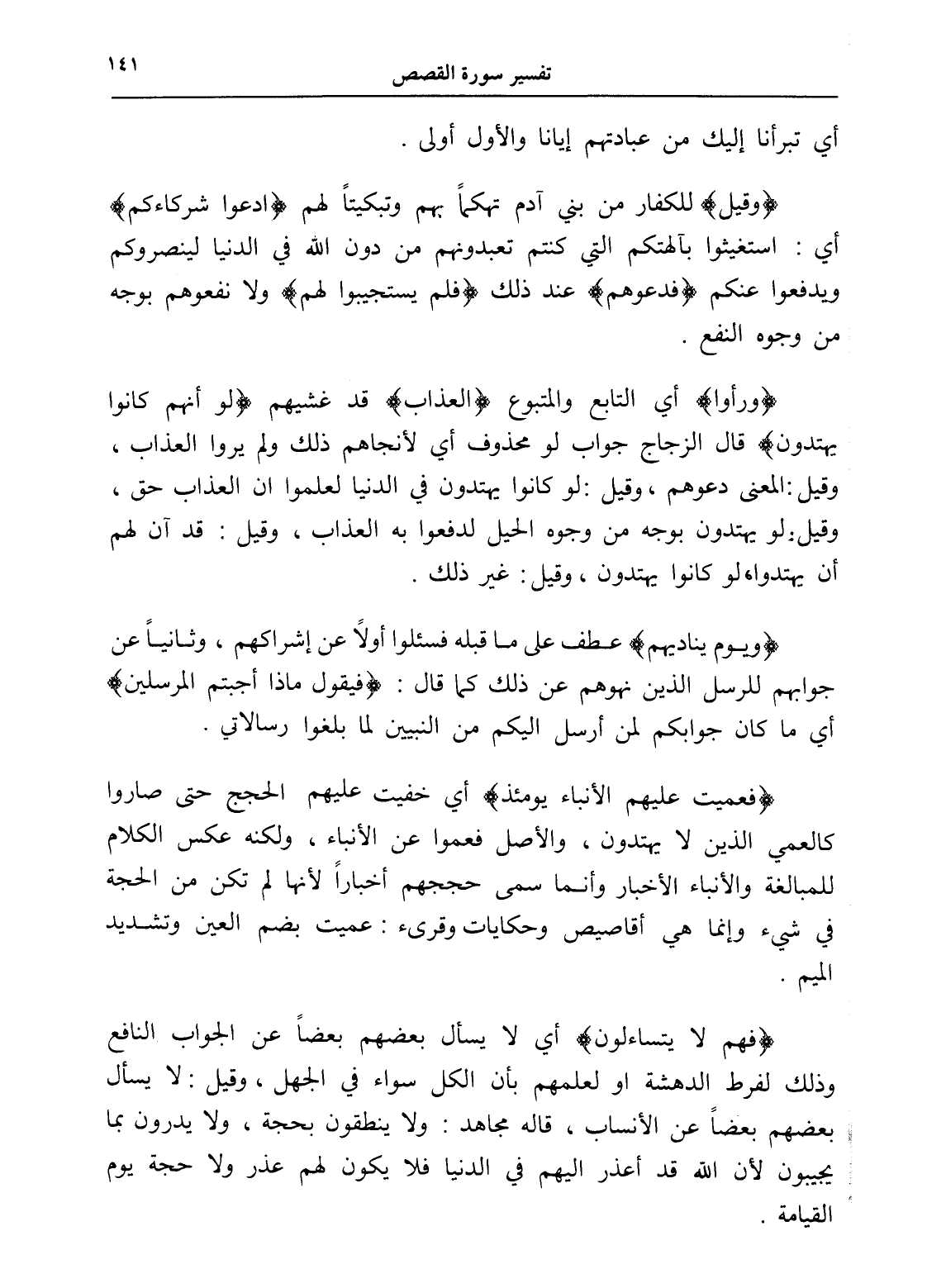 (فعميت عليهم الأنباء يومئذ) أي خفيت عليهم الحجج حتى صاروا كالعمي الذين لا يهتدون، والأصل فعموا عن الأنباء، ولكنه عكس الكلام للمبالغة والأنباء الأخبار وأنما سمى حججهم أخباراً لأنها لم تكن من الحجة في شيء وإنما هي أقاصيص وحكايات وقرئ: عميت بضم العين وتشديد الميم.