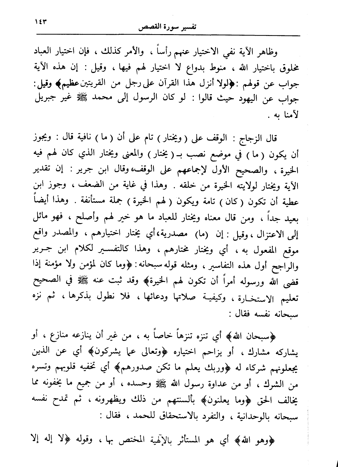 قال الزجاج: الوقف على (ويختار) تام على أن (ما) نافية قال: ويجوز أن يكون (ما) في موضع نصب بـ (يختار) والمعنى ويختار الذي كان لهم فيه الخيرة، والصحيح الأول لإجماعهم على الوقف، وقال ابن جرير: إن تقدير الآية ويختار لولايته الخيرة من خلقه. وهذا في غاية من الضعف، وجوز ابن عطية أن تكون (كان) تامة ويكون (لهم الخيرة) جملة مستأنفة. وهذا أيضاً بعيد جداً، ومن قال معناه ويختار للعباد ما هو خير لهم وأصلح، فهو مائل إلى الاعتزال، وقيل: إن (ما) مصدرية، أي يختار اختيارهم، والمصدر واقع موقع المفعول به، أي ويختار مختارهم، وهذا كالتفسير لكلام ابن جرير والراجح أول هذه التفاسير، ومثله قوله سبحانه: (وما كان لمؤمن ولا مؤمنة إذا قضى الله ورسوله أمراً أن تكون لهم الخيرة) وقد ثبت عنه - صلى الله عليه وسلم - في الصحيح تعليم الاستخارة، وكيفية صلاتها ودعائها، فلا نطول بذكرها، ثم نزه سبحانه نفسه فقال: